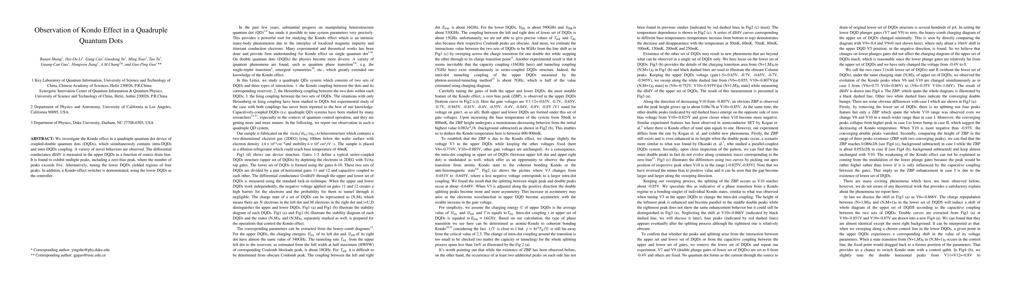 This research observes the Kondo effect in a quadruple quantum dot system with intra- and inter-double quantum dot couplings, revealing multiple conductance peaks, including a zero-bias peak, and demonstrating a Kondo-effect switch controlled by the lower DQDs.