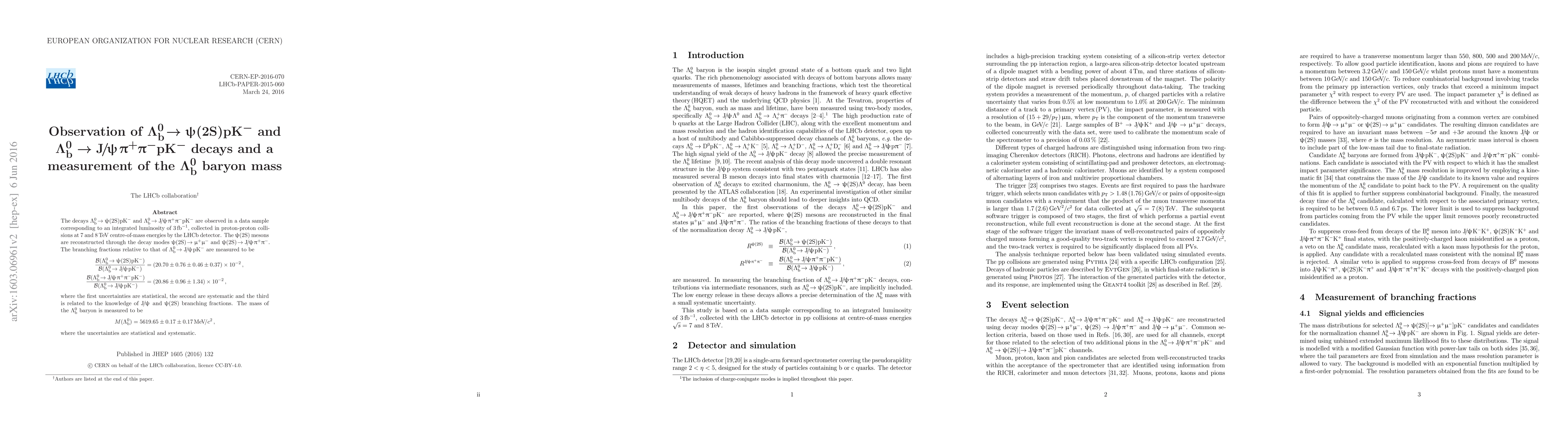 The LHCb experiment observes the decays $\Lambda_b^0 \to \psi(2S)pK^-$ and $\Lambda_b^0 \to J/\psi \pi^+ \pi^- pK^-$ with significant branching fractions relative to $\Lambda_b^0 \to J/\psi pK^-$, and measures the $\Lambda_b^0$ baryon mass as $5619.65 \pm 0.17 \pm 0.17$ MeV/c².