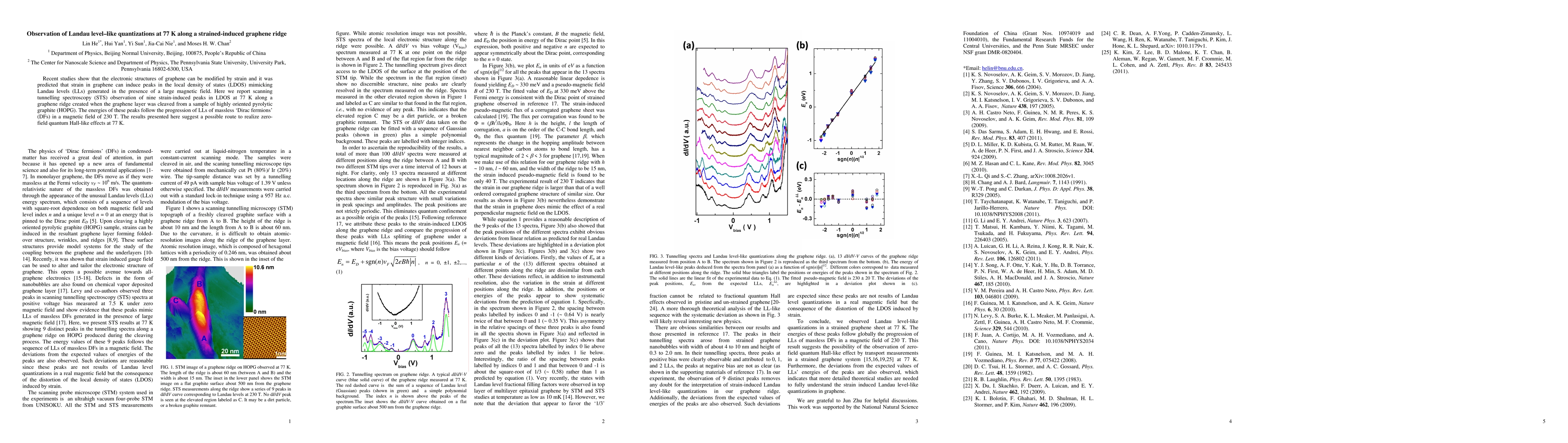 Recent studies show that the electronic structures of graphene can be modified by strain and it was predicted that strain in graphene can induce peaks in the local density of states (LDOS) mimicking Landau levels (LLs) generated in the presence of a large magnetic field. Here we report scanning tunnelling spectroscopy (STS) observation of nine strain-induced peaks in LDOS at 77 K along a graphene ridge created when the graphene layer was cleaved from a sample of highly oriented pyrolytic graphite (HOPG). The energies of these peaks follow the progression of LLs of massless 'Dirac fermions' (DFs) in a magnetic field of 230 T. The results presented here suggest a possible route to realize zero-field quantum Hall-like effects at 77 K.