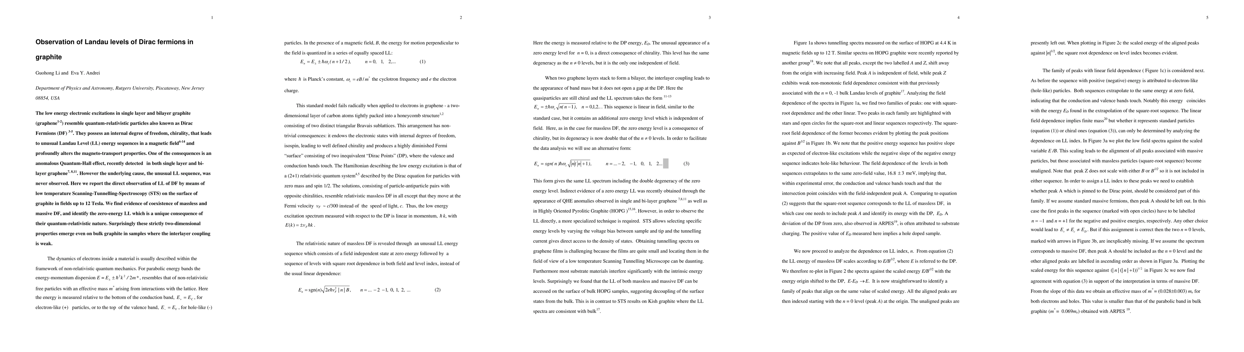 This paper reports the observation of Landau levels in Dirac fermions in graphite using low-temperature Scanning-Tunnelling-Spectroscopy, revealing the coexistence of massless and massive Dirac fermions and identifying the zero-energy Landau level, a unique quantum-relativistic feature that emerges even in bulk graphite with weak interlayer coupling.