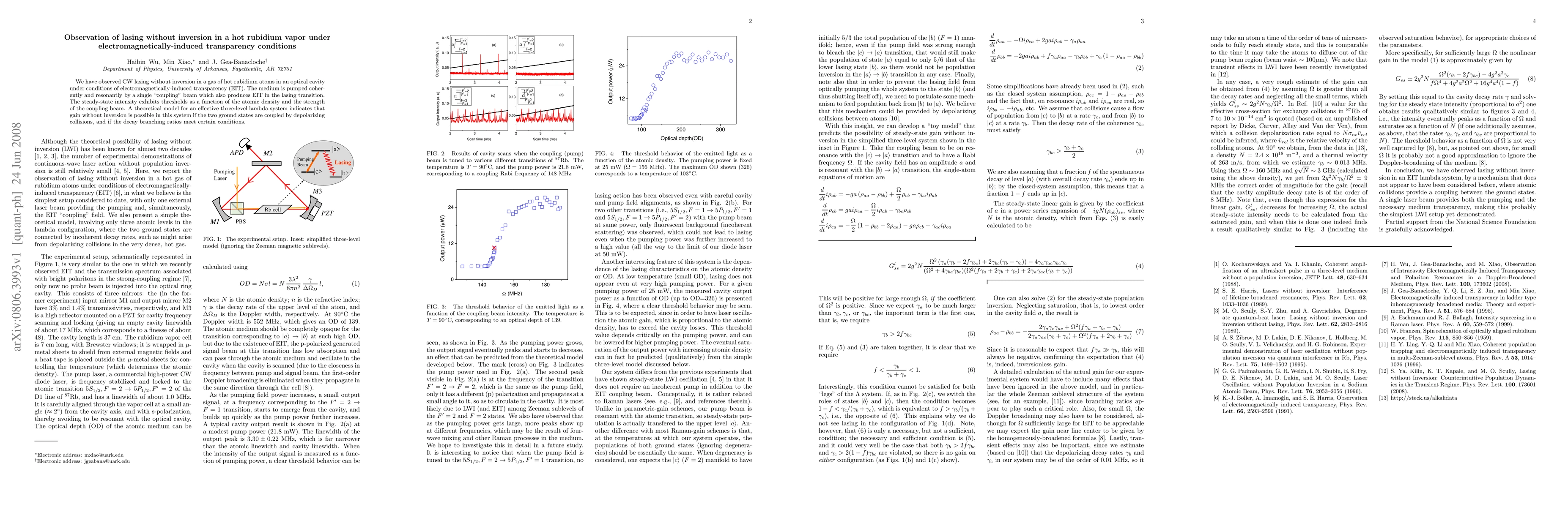 Summary: Researchers observed continuous wave lasing without population inversion in hot rubidium vapor using electromagnetically-induced transparency, where a single coupling beam induces transparency and provides gain. Theoretical modeling suggests gain can occur through depolarizing collisions and specific decay branching ratios.