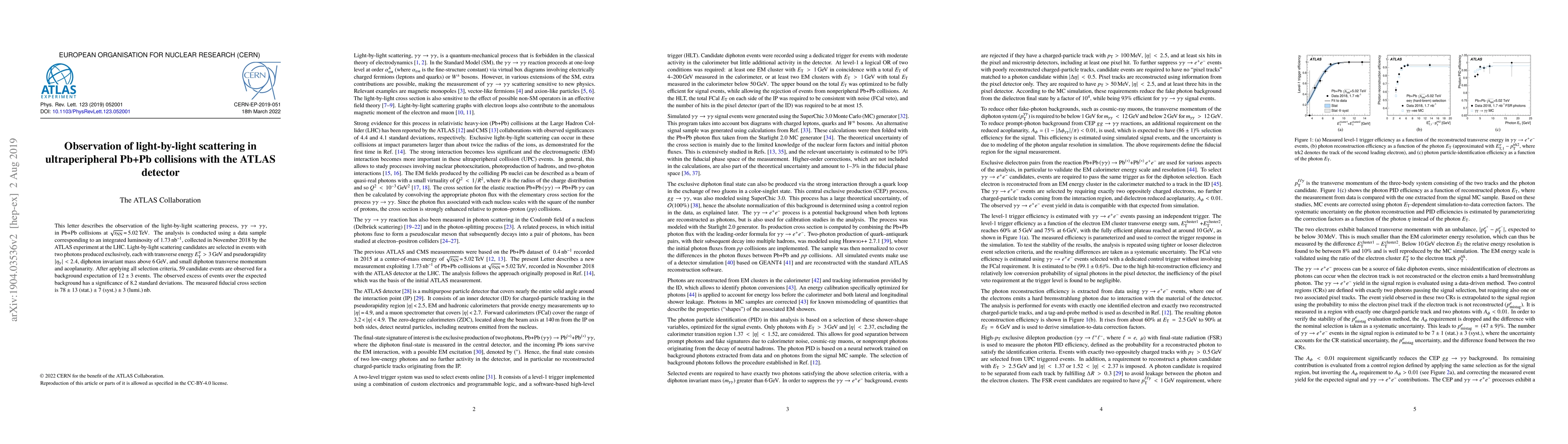 The ATLAS experiment at LHC observed light-by-light scattering in Pb+Pb collisions at 5.02 TeV, finding 59 candidate events against an expected 12 background events, indicating an 8.2 standard deviations excess. The fiducial cross section was measured as 78 ± 13 (stat.) ± 7 (syst.) ± 3 (lumi.) nb.