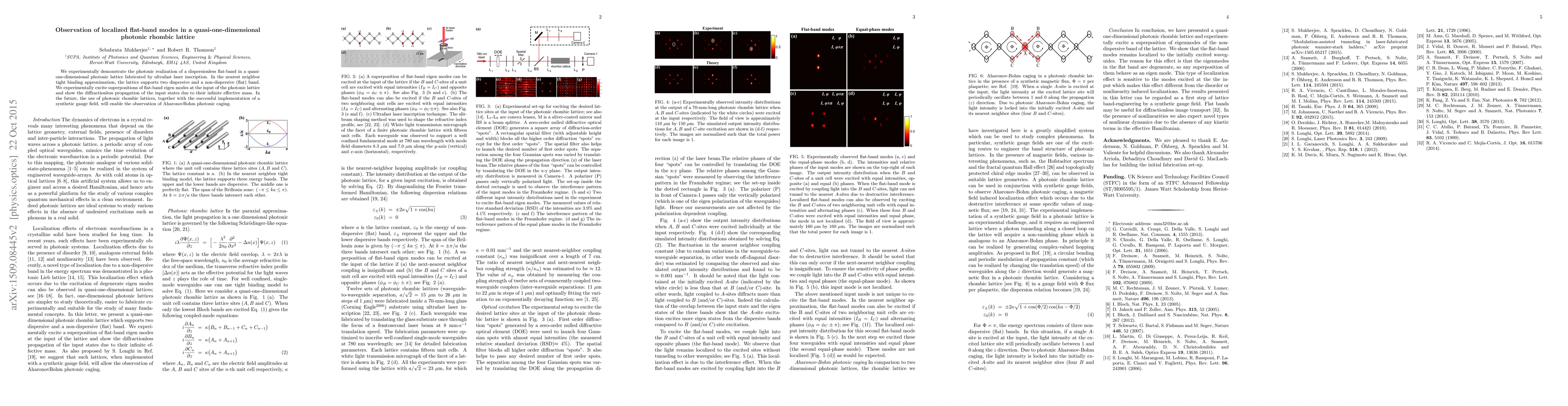 We experimentally demonstrate the photonic realization of a dispersionless flat-band in a quasi-one-dimensional photonic lattice fabricated by ultrafast laser inscription. In the nearest neighbor tight binding approximation, the lattice supports two dispersive and a non-dispersive (flat) band. We experimentally excite superpositions of flat-band eigen modes at the input of the photonic lattice and show the diffractionless propagation of the input states due to their infinite effective mass. In the future, the use of photonic rhombic lattices, together with the successful implementation of a synthetic gauge field, will enable the observation of Aharonov-Bohm photonic caging.