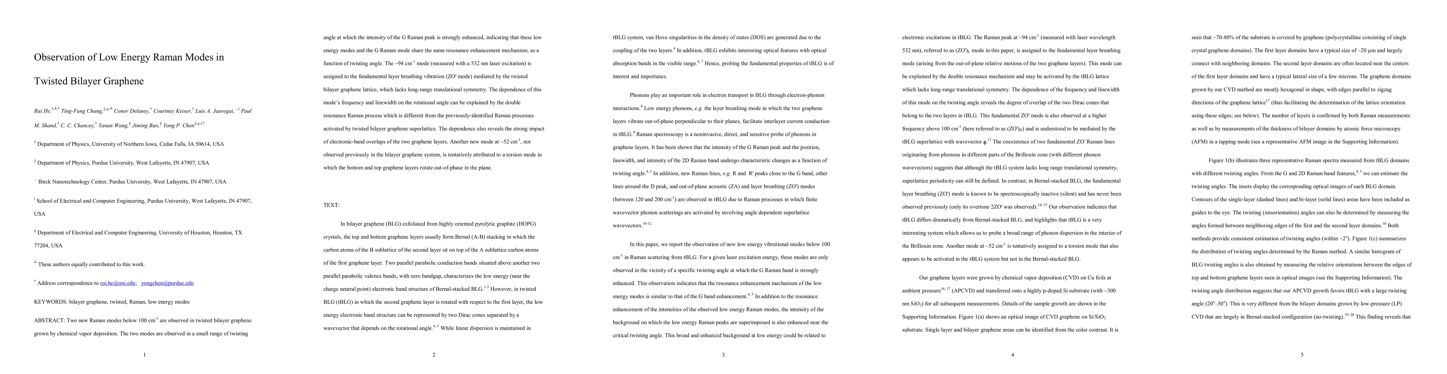 This study identifies two novel low-energy Raman modes in twisted bilayer graphene, revealing insights into the electronic interactions and lattice dynamics due to the lack of long-range symmetry. The 94 cm^-1 mode is linked to the fundamental layer breathing vibration, while the 52 cm^-1 mode suggests a torsional interaction between the graphene layers.