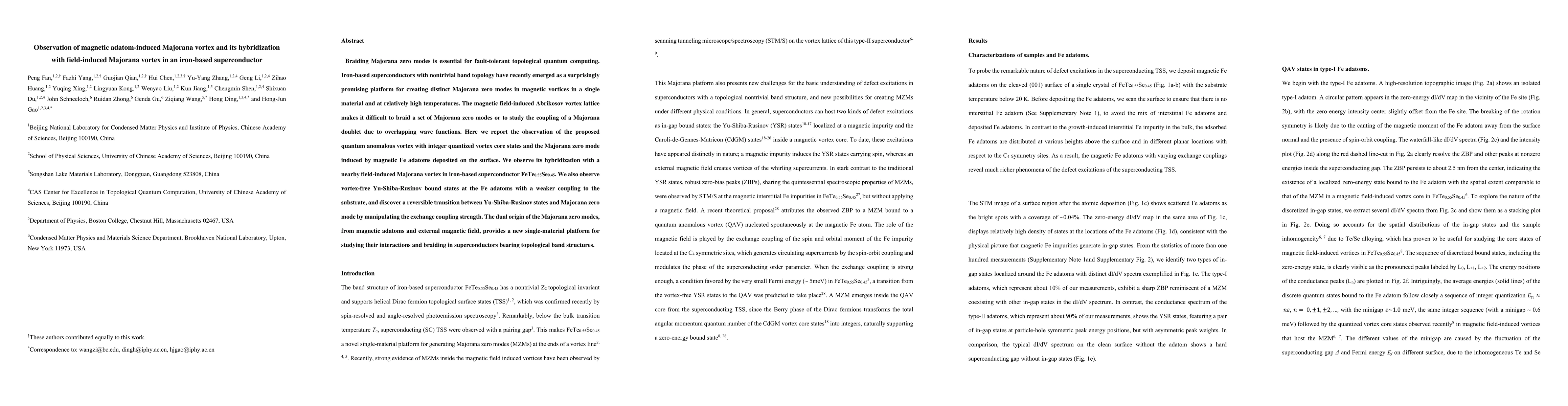 This paper reports the observation of a quantum anomalous vortex with integer quantized vortex core states and a Majorana zero mode induced by magnetic Fe adatoms on FeTe0.55Se0.45. It also investigates the hybridization of this adatom-induced Majorana zero mode with a field-induced Majorana vortex, revealing a reversible transition between Yu-Shiba-Rusinov states and Majorana zero modes by adjusting the exchange coupling strength.