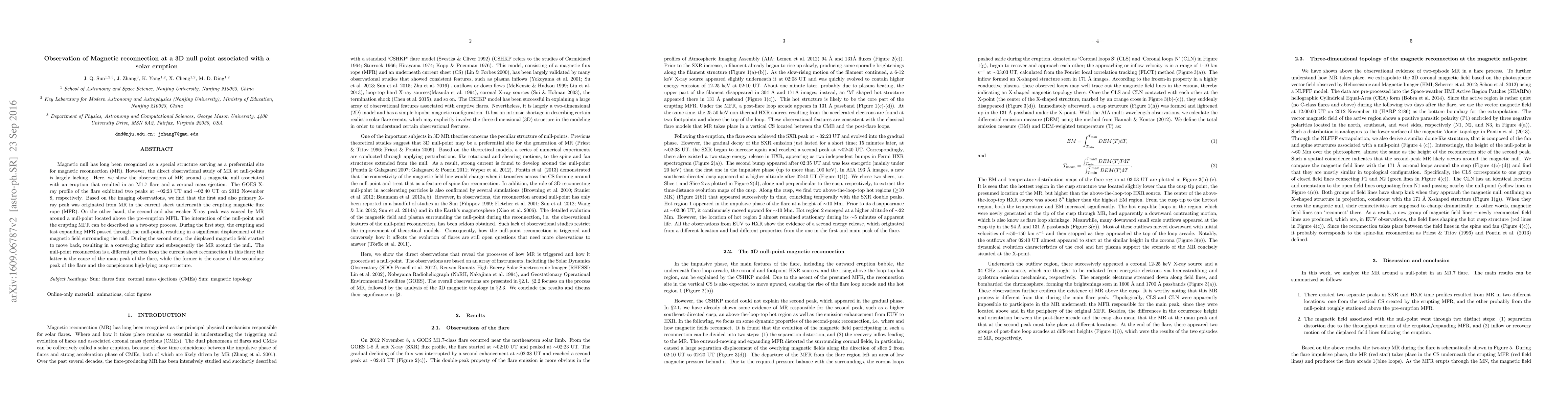 This study observes magnetic reconnection (MR) at a 3D null point linked to a solar eruption, resulting in an M1.7 flare and a coronal mass ejection. The primary X-ray peak is attributed to MR in the current sheet beneath the erupting flux rope, while the secondary peak is due to MR around the null-point above the pre-eruption flux rope, showcasing a two-step interaction process.