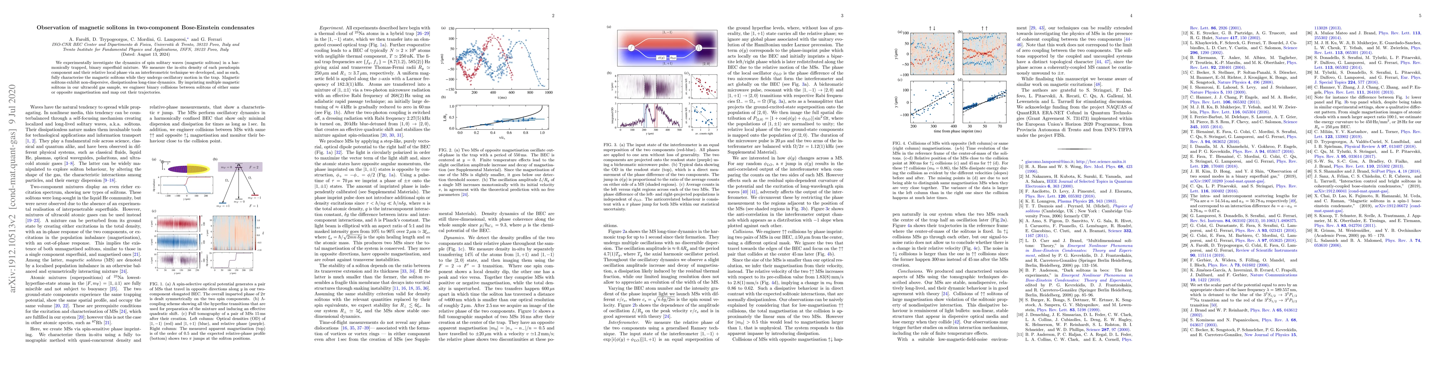 We experimentally investigate the dynamics of spin solitary waves (magnetic solitons) in a harmonically trapped, binary superfluid mixture. We measure the in-situ density of each pseudospin component and their relative local phase via an interferometric technique we developed, and as such, fully characterise the magnetic solitons while they undergo oscillatory motion in the trap. Magnetic solitons exhibit non-dispersive, dissipationless long-time dynamics. By imprinting multiple magnetic solitons in our ultracold gas sample, we engineer binary collisions between solitons of either same or opposite magnetisation and map out their trajectories.