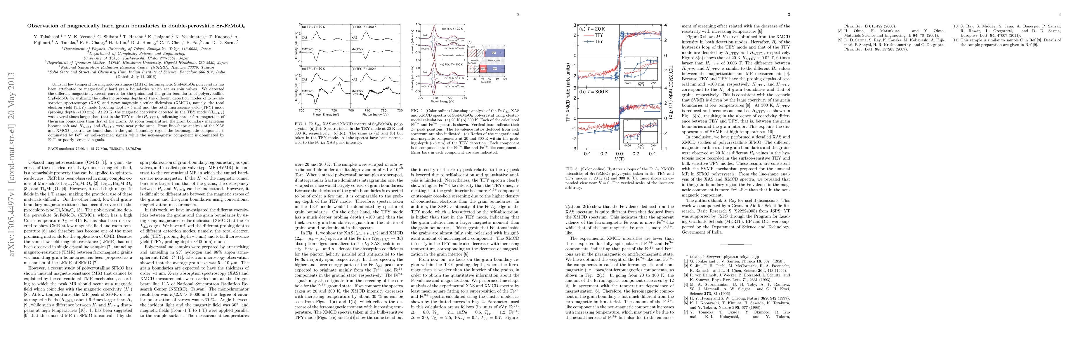 This study reveals that magnetically hard grain boundaries in Sr$_{2}$FeMoO$_{6}$ polycrystals exhibit unusual low-temperature magneto-resistance due to their role as spin valves. X-ray spectroscopy detected significantly higher magnetic coercivity in grain boundaries compared to grains, indicating stronger ferromagnetism at low temperatures.