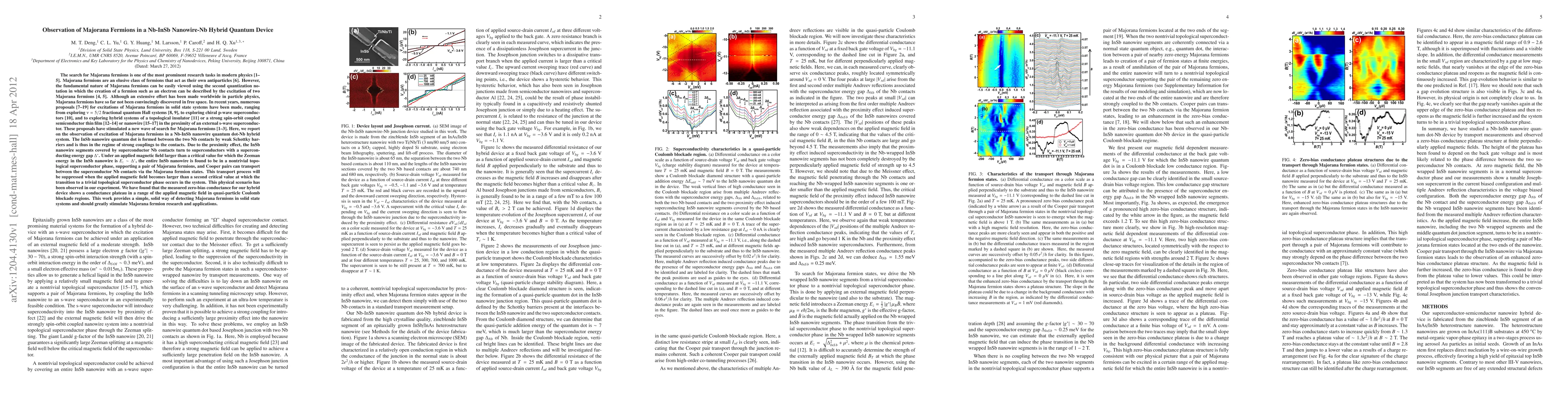 The research paper observes Majorana fermions in a Nb-InSb nanowire quantum dot-Nb hybrid system, showing that under a critical magnetic field, the nanowire enters a topological superconductor phase supporting Majorana fermions, which enable unique transport properties. Experimental results show a zero-bias conductance plateau, confirming the presence of Majorana fermions.