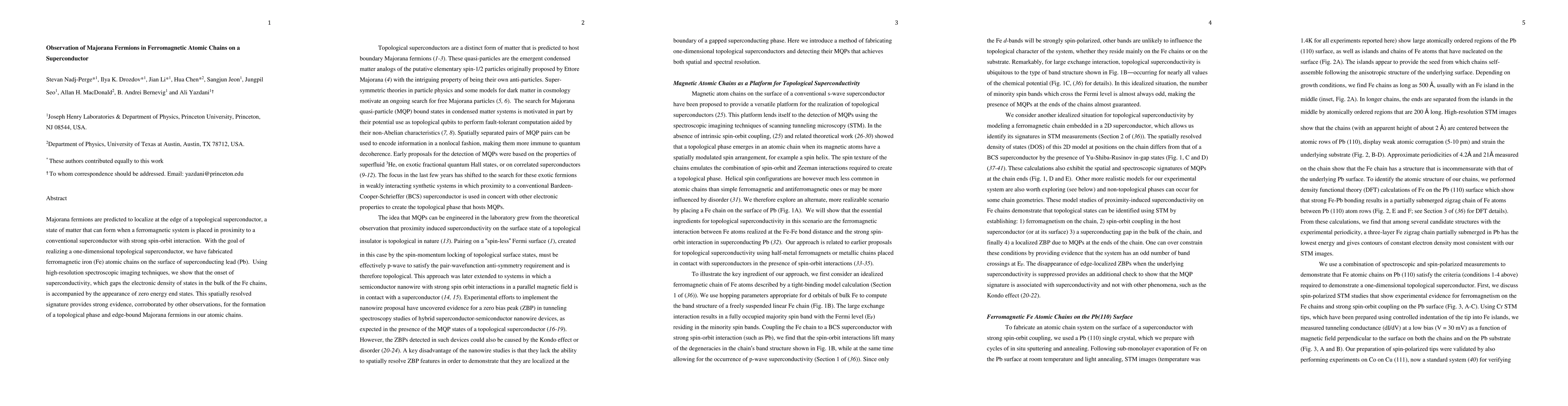 Researchers fabricated ferromagnetic iron atomic chains on superconducting lead and observed zero energy end states with spectroscopic imaging, providing evidence for the presence of Majorana fermions in a one-dimensional topological superconductor. These findings support the prediction of topological superconductivity in such ferromagnetic atomic chains.