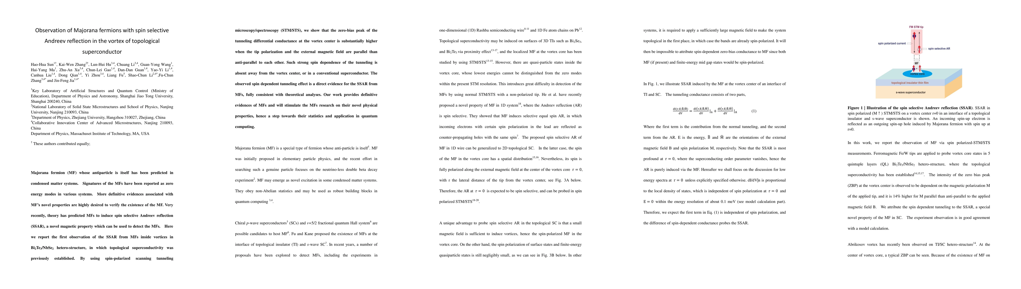 This paper reports the first observation of spin selective Andreev reflection (SSAR) from Majorana fermions (MFs) in the vortex of a topological superconductor, using spin-polarized scanning tunneling microscopy/spectroscopy. The study finds a strong spin dependence in the zero-bias peak at the vortex center, providing definitive evidence for MFs and advancing research into their potential applications in quantum computing.
