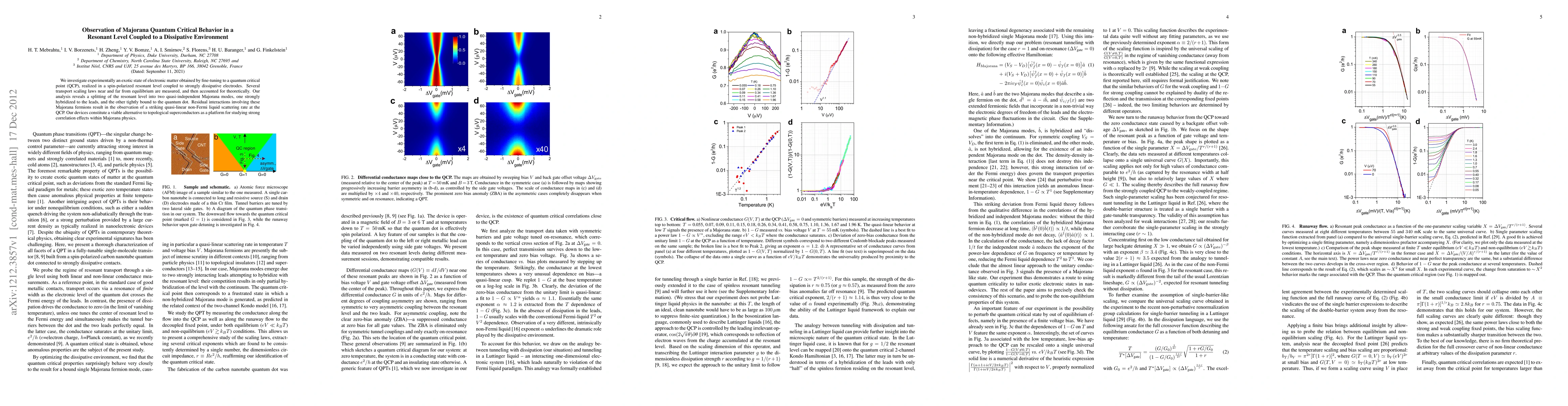 We investigate experimentally an exotic state of electronic matter obtained by fine-tuning to a quantum critical point (QCP), realized in a spin-polarized resonant level coupled to strongly dissipative electrodes. Several transport scaling laws near and far from equilibrium are measured, and then accounted for theoretically. Our analysis reveals a splitting of the resonant level into two quasi-independent Majorana modes, one strongly hybridized to the leads, and the other tightly bound to the quantum dot. Residual interactions involving these Majorana fermions result in the observation of a striking quasi-linear non-Fermi liquid scattering rate at the QCP. Our devices constitute a viable alternative to topological superconductors as a platform for studying strong correlation effects within Majorana physics.