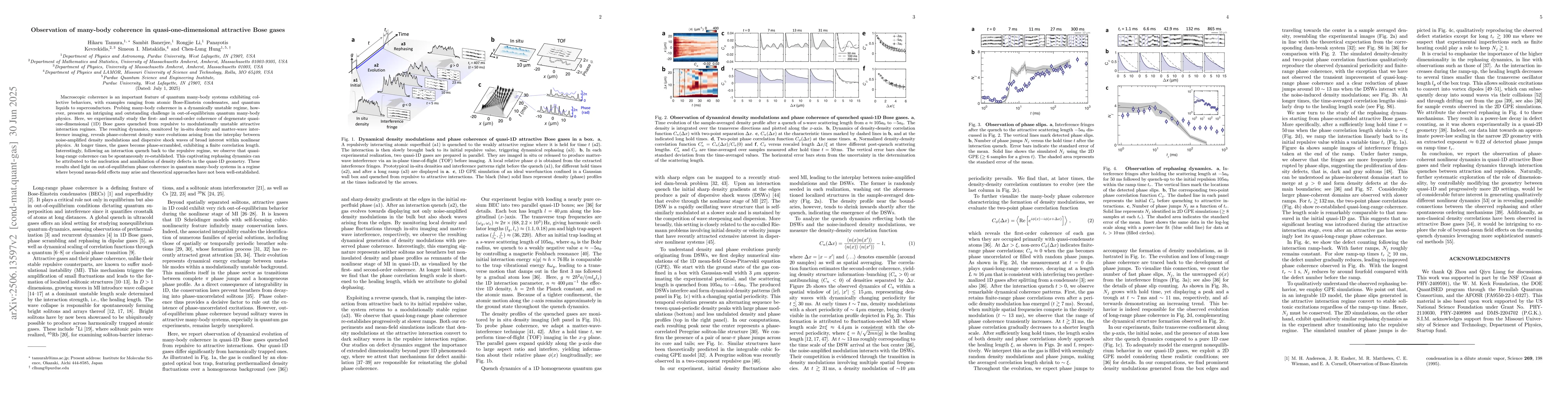Macroscopic coherence is an important feature of quantum many-body systems exhibiting collective behaviors, with examples ranging from atomic Bose-Einstein condensates, and quantum liquids to superconductors. Probing many-body coherence in a dynamically unstable regime, however, presents an intriguing and outstanding challenge in out-of-equilibrium quantum many-body physics. Here, we experimentally study the first- and second-order coherence of degenerate quasi-one-dimensional (1D) Bose gases quenched from repulsive to modulationally unstable attractive interaction regimes. The resulting dynamics, monitored by in-situ density and matter-wave interference imaging, reveals phase-coherent density wave evolutions arising from the interplay between noise-amplified density modulations and dispersive shock waves of broad interest within nonlinear physics. At longer times, the gases become phase-scrambled, exhibiting a finite correlation length. Interestingly, following an interaction quench back to the repulsive regime, we observe that quasi-long-range coherence can be spontaneously re-established. This captivating rephasing dynamics can be attributed to the nucleation and annihilation of density defects in the quasi-1D geometry. These results shed light on out-of-equilibrium phase coherence in quantum many-body systems in a regime where beyond mean-field effects may arise and theoretical approaches have not been well-established.
