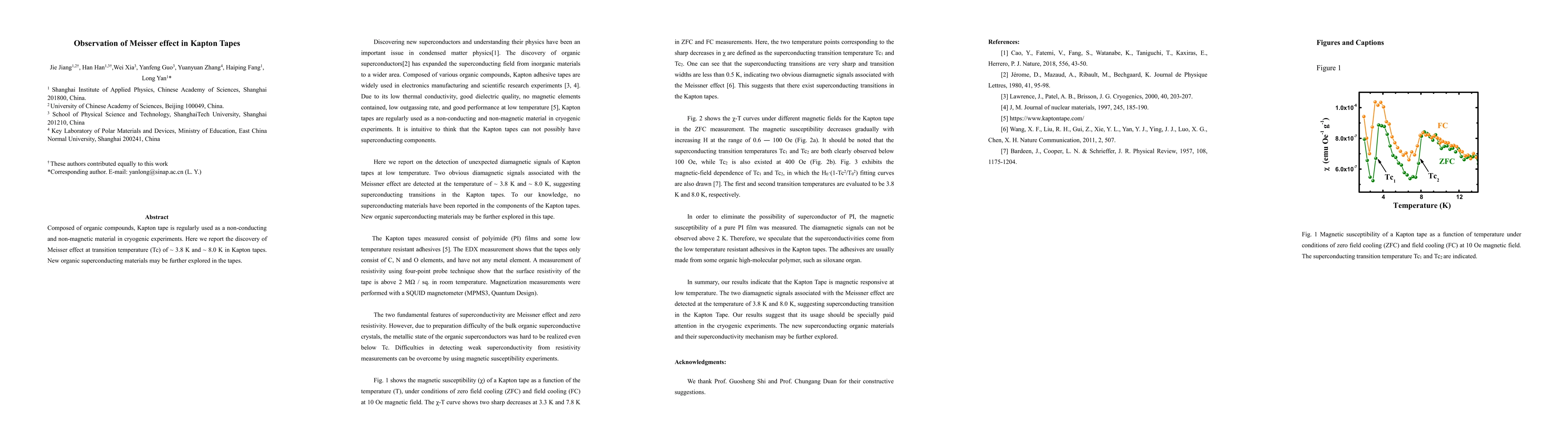 Composed of organic compounds, Kapton tape is regularly used as a non-conducting and non-magnetic material in cryogenic experiments. Here we report the discovery of Meisser effect at transition temperature (Tc) of ~ 3.8 K and ~ 8.0 K in Kapton tapes. New organic superconducting materials may be further explored in the tapes.