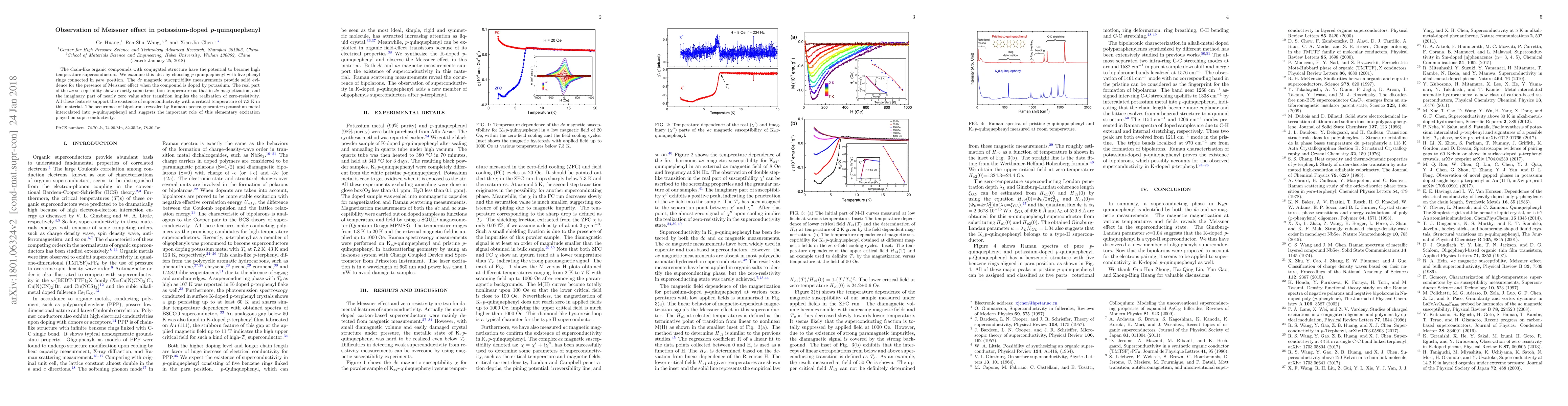 The chain-like organic compounds with conjugated structure have the potential to become high temperature superconductors. We examine this idea by choosing p-quinquephenyl with five phenyl rings connected in para position. The dc magnetic susceptibility measurements provide solid evidence for the presence of Meissner effect when the compound is doped by potassium. The real part of the ac susceptibility shows exactly same transition temperature as that in dc magnetization, and the imaginary part of nearly zero value after transition implies the realization of zero-resistivity. All these features support the existence of superconductivity with a critical temperature of 7.3 K in this material. The occurrence of bipolarons revealed by Raman spectra guarantees potassium metal intercalated into p-quinquephenyl and suggests the important role of this elementary excitation played on superconductivity.