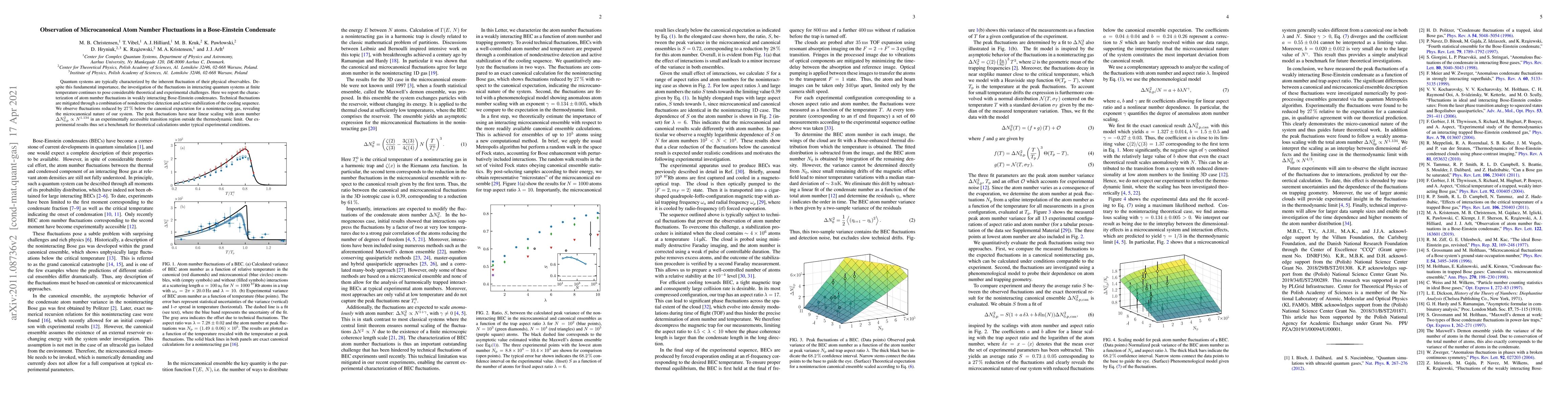 Quantum systems are typically characterized by the inherent fluctuation of their physical observables. Despite this fundamental importance, the investigation of the fluctuations in interacting quantum systems at finite temperature continues to pose considerable theoretical and experimental challenges. Here we report the characterization of atom number fluctuations in weakly interacting Bose-Einstein condensates. Technical fluctuations are mitigated through a combination of non-destructive detection and active stabilization of the cooling sequence. We observe fluctuations reduced by \SI{27}{\percent} below the canonical expectation for a non-interacting gas, revealing the microcanonical nature of our system. The peak fluctuations have near linear scaling with atom number $\Delta N_{0,\mathrm{p}}^2 \propto N^{1.134}$ in an experimentally accessible transition region outside the thermodynamic limit. Our experimental results thus set a benchmark for theoretical calculations under typical experimental conditions.