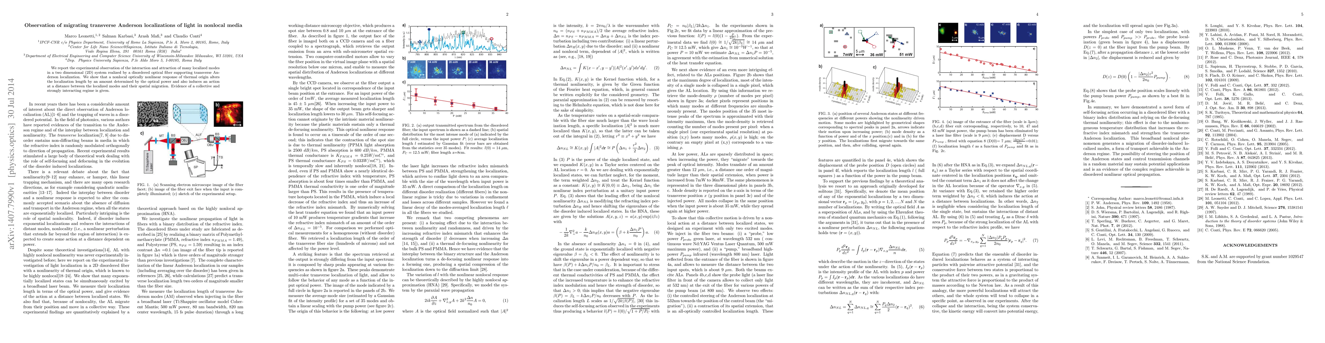This research paper reports the experimental observation of transverse Anderson localizations of light migrating in a disordered optical fiber, where a nonlocal optical nonlinearity alters localization length and induces spatial migration and interaction among localized modes. Evidence of a collective, strongly interacting regime is provided.