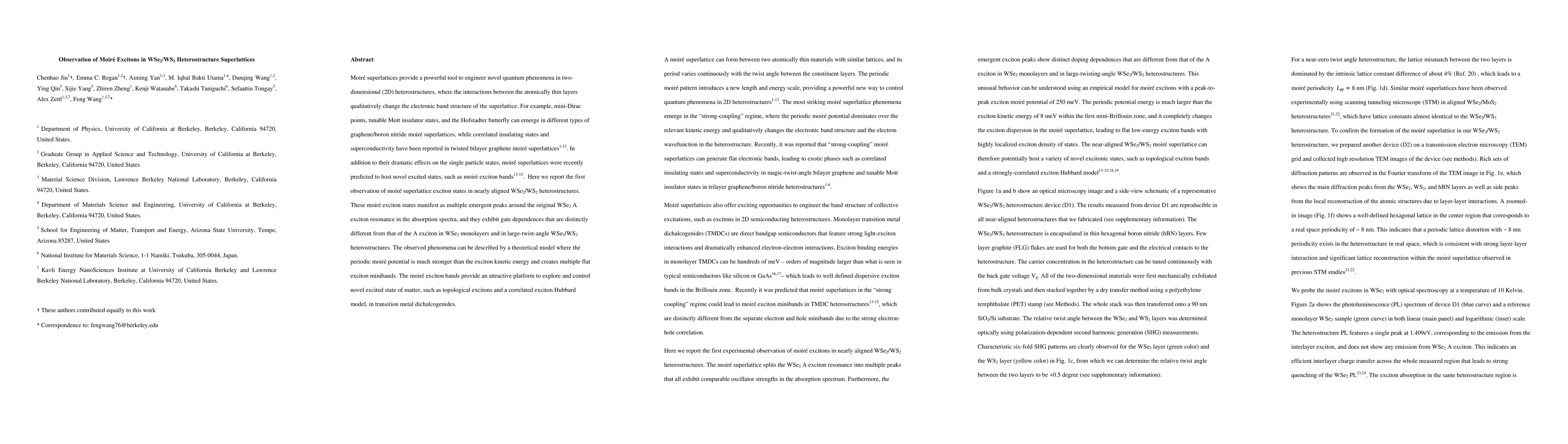 This research reports the first observation of moiré exciton states in nearly aligned WSe2/WS2 heterostructure superlattices, showing multiple peaks in absorption spectra that differ from monolayer WSe2. The findings are explained by a theoretical model indicating strong moiré potential creating exciton minibands, opening new avenues for studying topological excitons and correlated exciton Hubbard models.