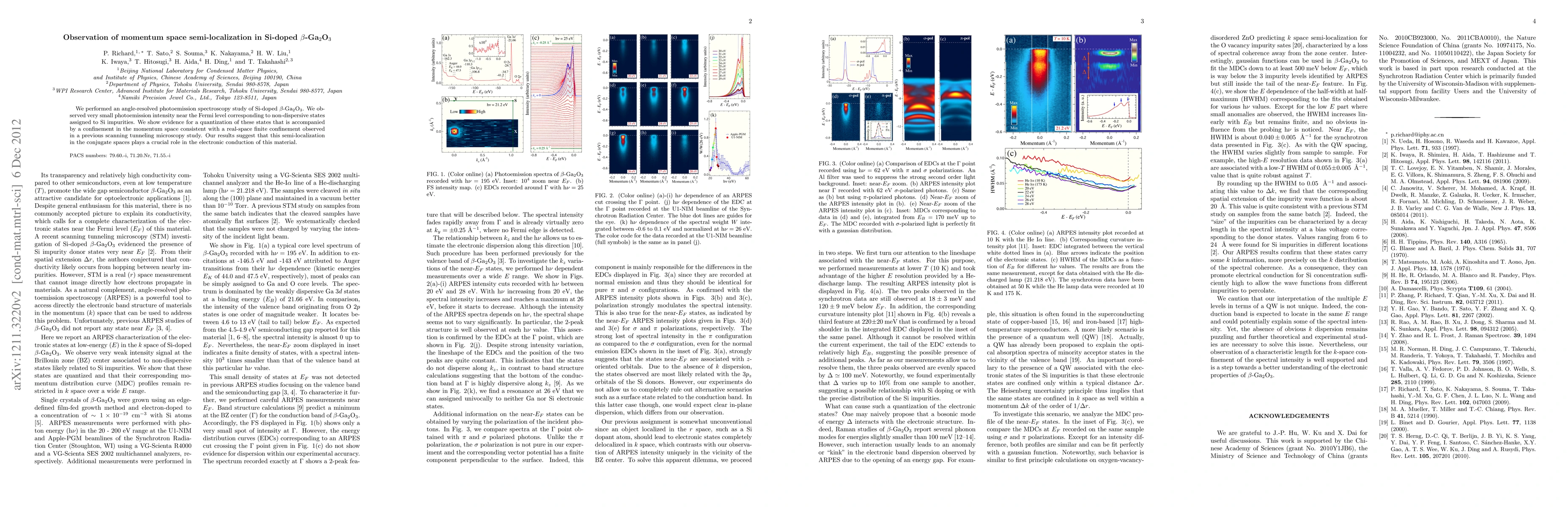 We performed an angle-resolved photoemission spectroscopy study of Si-doped $\beta$-Ga$_2$O$_3$. We observed very small photoemission intensity near the Fermi level corresponding to non-dispersive states assigned to Si impurities. We show evidence for a quantization of these states that is accompanied by a confinement in the momentum space consistent with a real-space finite confinement observed in a previous scanning tunneling microscopy study. Our results suggest that this semi-localization in the conjugate spaces plays a crucial role in the electronic conduction of this material.