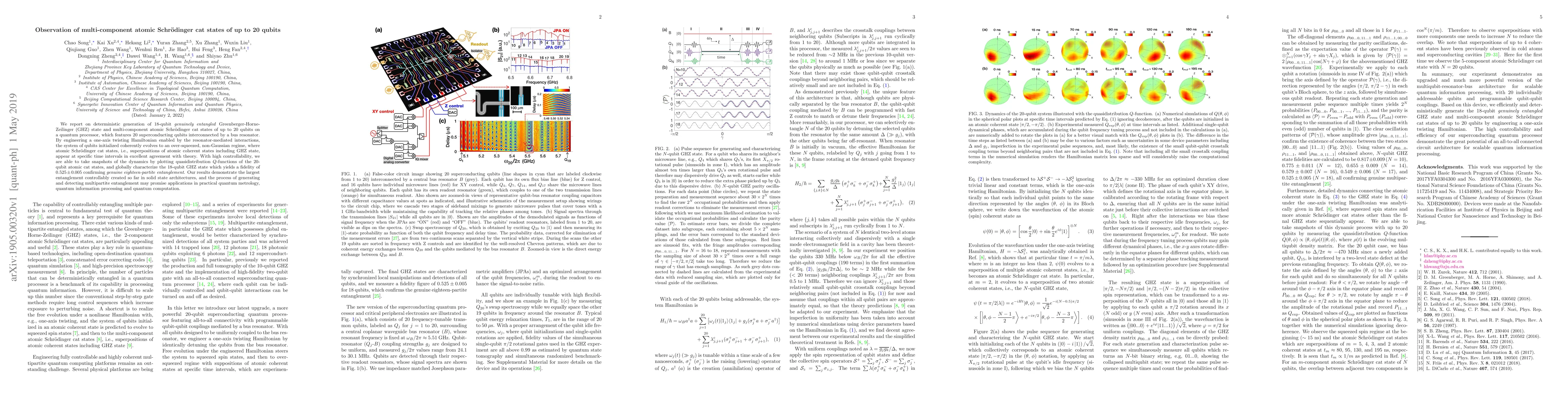 We report on deterministic generation of 18-qubit genuinely entangled Greenberger-Horne-Zeilinger (GHZ) state and multi-component atomic Schr\"{o}dinger cat states of up to 20 qubits on a quantum processor, which features 20 superconducting qubits interconnected by a bus resonator. By engineering a one-axis twisting Hamiltonian enabled by the resonator-mediated interactions, the system of qubits initialized coherently evolves to an over-squeezed, non-Gaussian regime, where atomic Schr\"{o}dinger cat states, i.e., superpositions of atomic coherent states including GHZ state, appear at specific time intervals in excellent agreement with theory. With high controllability, we are able to take snapshots of the dynamics by plotting quasidistribution $Q$-functions of the 20-qubit atomic cat states, and globally characterize the 18-qubit GHZ state which yields a fidelity of $0.525\pm0.005$ confirming genuine eighteen-partite entanglement. Our results demonstrate the largest entanglement controllably created so far in solid state architectures, and the process of generating and detecting multipartite entanglement may promise applications in practical quantum metrology, quantum information processing and quantum computation.