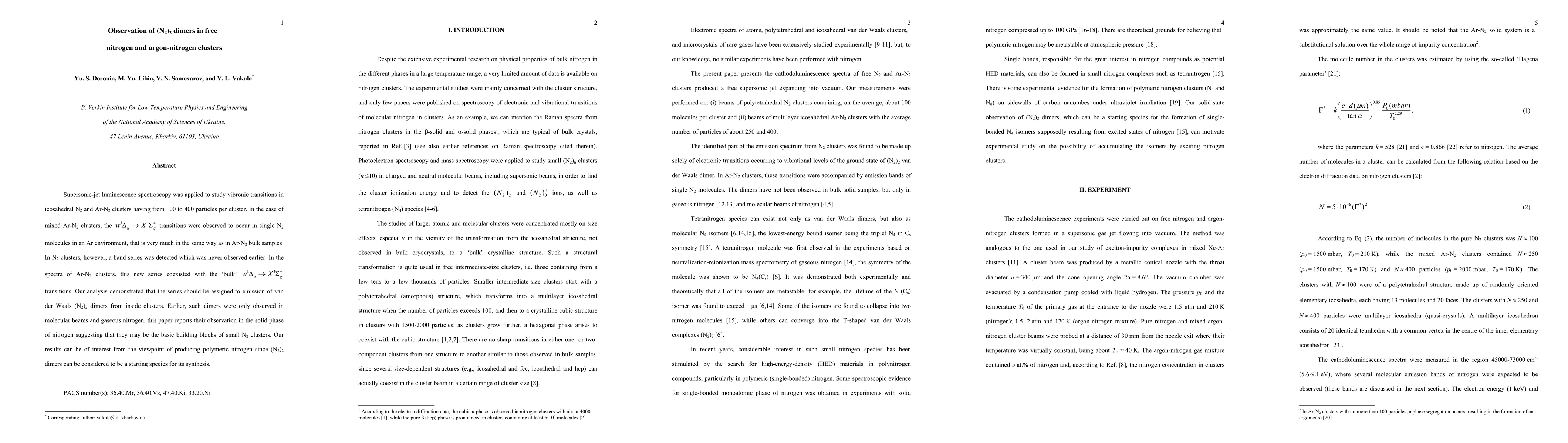 Supersonic-jet luminescence spectroscopy was applied to study vibronic transitions in icosahedral N2 and Ar-N2 clusters having from 100 to 400 particles per cluster. In the case of mixed Ar-N2 clusters, the w->X transitions were observed to occur in single N2 molecules in an Ar environment, that is very much in the same way as in Ar-N2 bulk samples. In N2 clusters, however, a band series was detected which was never observed earlier. In the spectra of Ar-N2 clusters, this new series coexisted with the 'bulk' w->X transitions. Our analysis demonstrated that the series should be assigned to emission of van der Waals (N2)2 dimers from inside clusters. Earlier, such dimers were only observed in molecular beams and gaseous nitrogen, this paper reports their observation in the solid phase of nitrogen suggesting that they may be the basic building blocks of small N2 clusters. Our results can be of interest from the viewpoint of producing polymeric nitrogen since (N2)2 dimers can be considered to be a starting species for its synthesis.