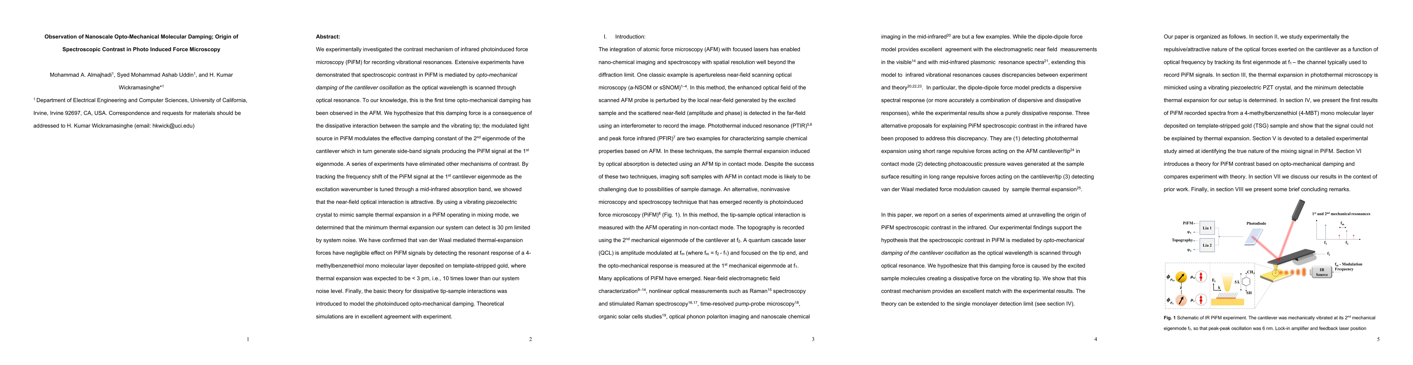Researchers observed opto-mechanical damping in atomic force microscopy, a phenomenon that affects spectroscopic contrast when using infrared light to scan the surface of materials. This damping is caused by the interaction between the tip and sample, leading to side-band signals and altering the observed signal.