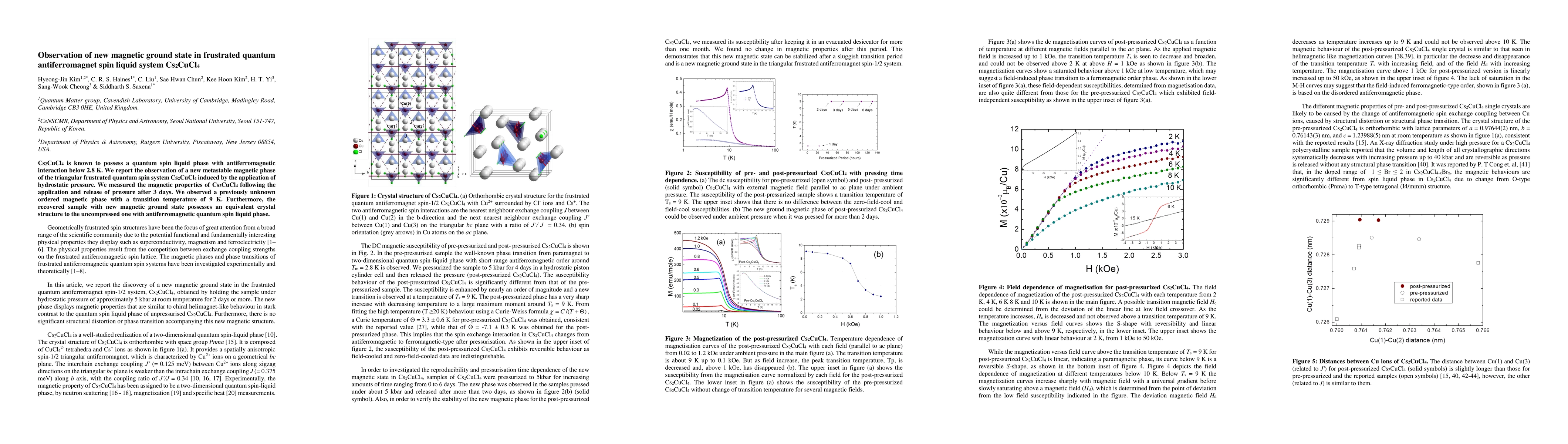 This study reports the discovery of a new metastable magnetic phase in the frustrated quantum antiferromagnet spin liquid system Cs2CuCl4 under hydrostatic pressure, transitioning to an ordered magnetic phase at 9 K. The sample retains its original crystal structure after pressure release, indicating a unique magnetic ground state.