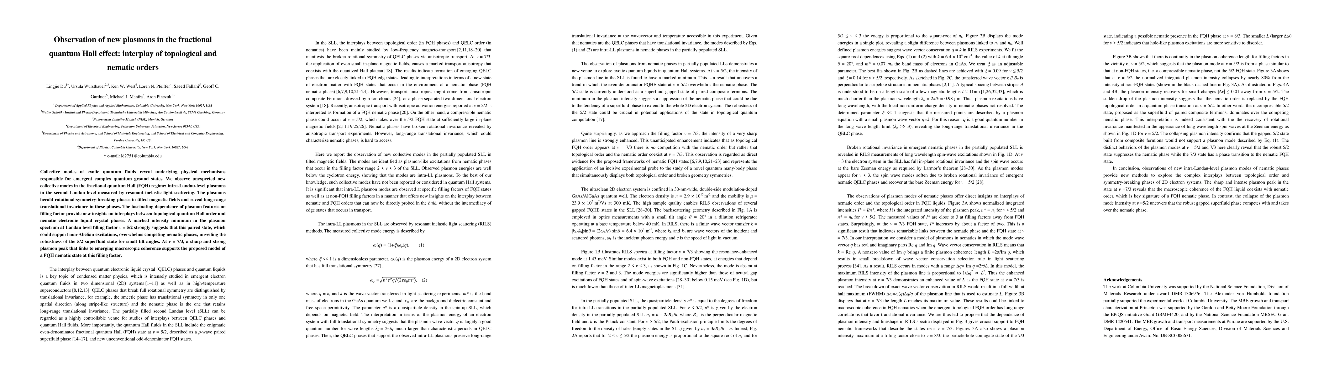 This paper observes new intra-Landau-level plasmons in the fractional quantum Hall effect, revealing rotational-symmetry-breaking phases and interactions between topological and nematic orders, with significant insights into the robustness of the 5/2 superfluid state and the emergence of coherence at v = 7/3.
