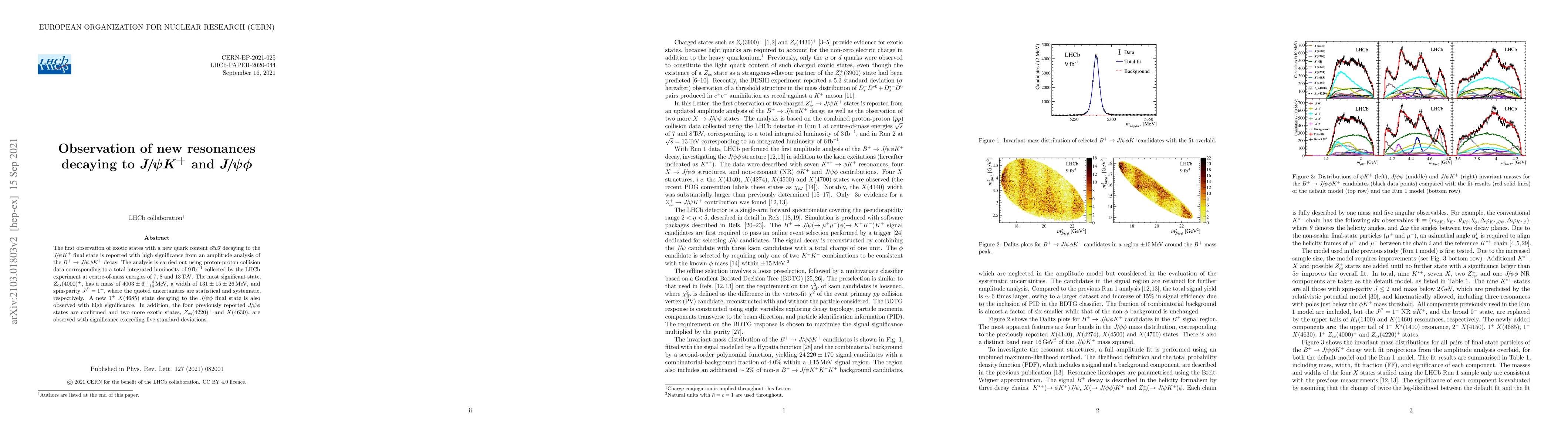 The first observation of exotic states with a new quark content $c \bar{c} u \bar{s}$ decaying to the $J/\psi K^+$ final state is reported with high significance from an amplitude analysis of the $B^+ \to J/\psi \phi K^+$ decay. The analysis is carried out using proton-proton collision data corresponding to a total integrated luminosity of 9 fb$^{-1}$ collected by the LHCb experiment at centre-of-mass energies of 7, 8 and 13 TeV. The most significant state, $Z_{cs}(4000)^+$, has a mass of $4003\pm6\,^{+\,\phantom{0}4}_{-\,14}$ MeV, a width of $131\pm15\pm26$ MeV, and spin-parity $J^P=1^+$, where the quoted uncertainties are statistical and systematic, respectively. A new $1^+$ $X(4685)$ state decaying to the $J/\psi \phi$ final state is also observed with high significance. In addition, the four previously reported $J/\psi \phi$ states are confirmed and two more exotic states, $Z_{cs}(4220)^+$ and $X(4630)$, are observed with significance exceeding five standard deviations.