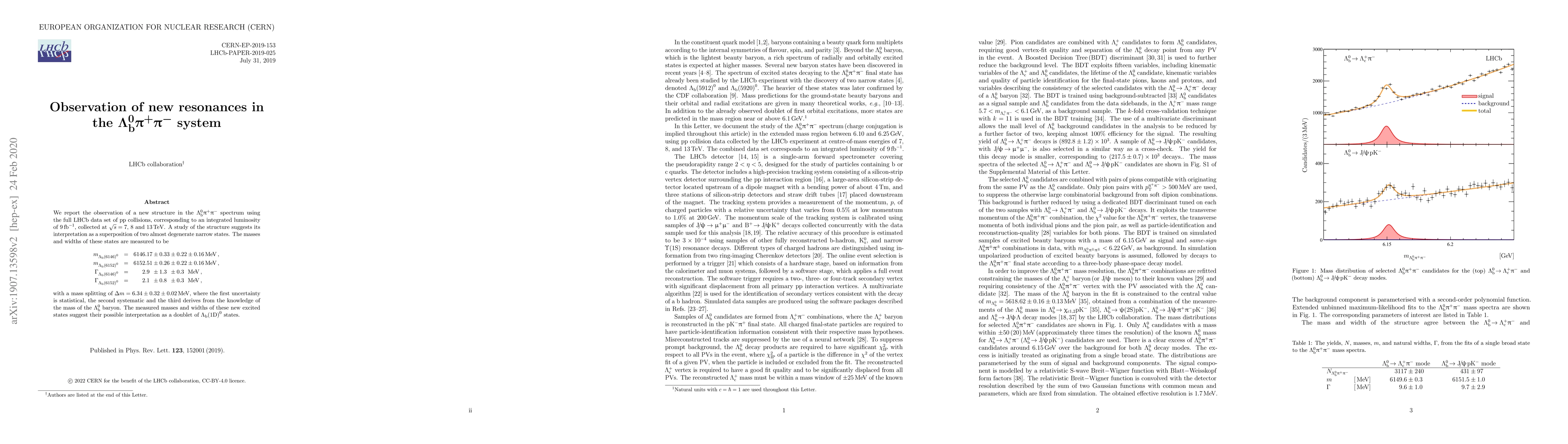 We report the observation of a new structure in the $\Lambda_b^0 \pi^+\pi^-$ spectrum using the full LHCb data set of $pp$ collisions, corresponding to an integrated luminosity of $9\,\mathrm{fb}^{-1}$, collected at $\sqrt{s}=7$, 8 and $13\,\mathrm{TeV}$. A study of the structure suggests its interpretation as a superposition of two almost degenerate narrow states. The masses and widths of these states are measured to be \begin{eqnarray*} m_{\Lambda_{b}\mathrm{(6146)}^0} &=&6146.17 \pm 0.33 \pm 0.22 \pm 0.16\,\mathrm{MeV} \,, m_{\Lambda_{b}\mathrm{(6152)}^0} &=&6152.51 \pm 0.26 \pm 0.22 \pm 0.16\,\mathrm{MeV} \,, \Gamma_{\Lambda_{b}\mathrm{(6146)}^0}&=&\phantom{615}2.9\phantom{0}\pm 1.3\phantom{0} \pm 0.3\phantom{0}\,\mathrm{MeV}\,, \Gamma_{\Lambda_{b}\mathrm{(6152)}^0} &=&\phantom{615}2.1\phantom{0}\pm 0.8\phantom{0} \pm 0.3\phantom{0}\,\mathrm{MeV}\,, \end{eqnarray*} with a mass splitting of $\Delta m = 6.34 \pm 0.32 \pm 0.02\,\mathrm{MeV}$, where the first uncertainty is statistical, the second systematic and the third derives from the knowledge of the mass of the $\Lambda_b^0$ baryon. The measured masses and widths of these new excited states suggest their possible interpretation as a doublet of $\Lambda_{b}\mathrm{(1D)}^0$ states.