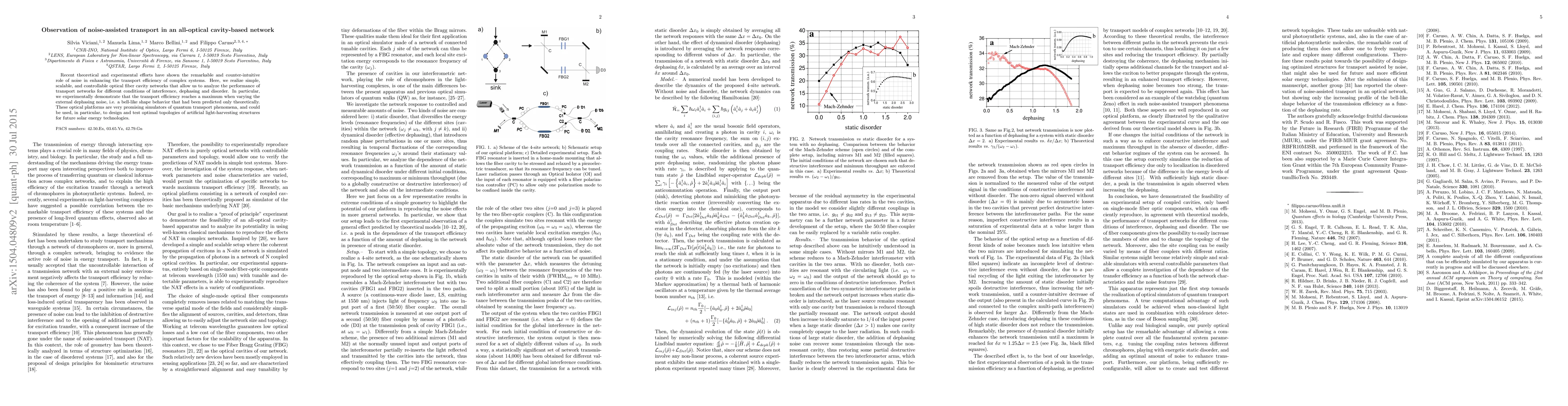 This paper observes noise-assisted transport in optical fiber cavity networks, demonstrating experimentally that transport efficiency peaks under optimal dephasing noise conditions, mirroring theoretical predictions. These optical systems serve as promising simulators for quantum transport and potential tools for designing efficient light-harvesting structures in solar energy technologies.
