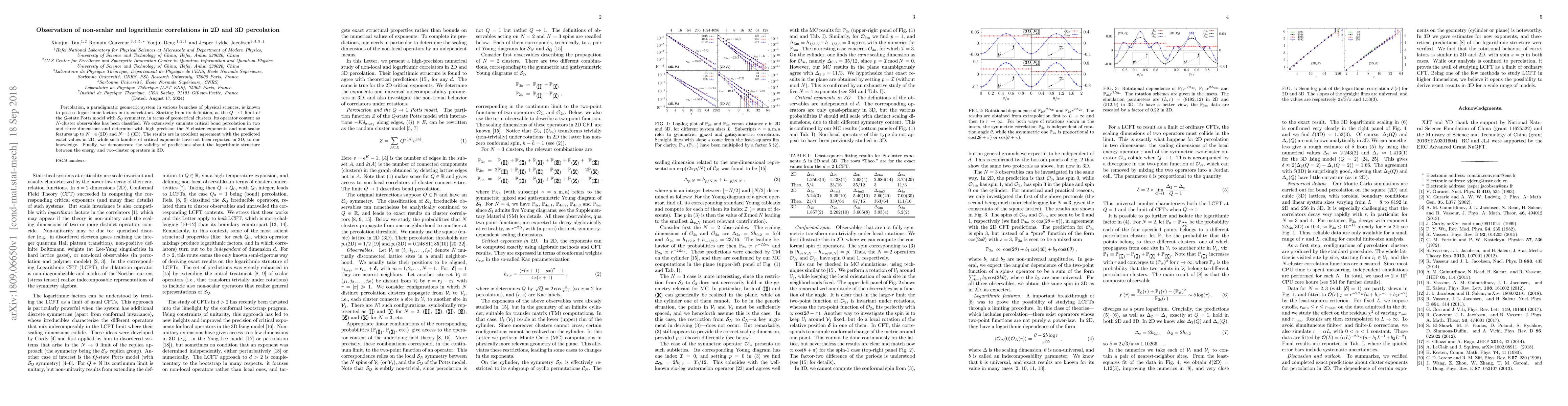 Researchers study percolation in 2D and 3D, finding logarithmic correlations and unexpected exponents that disagree with previous knowledge.
