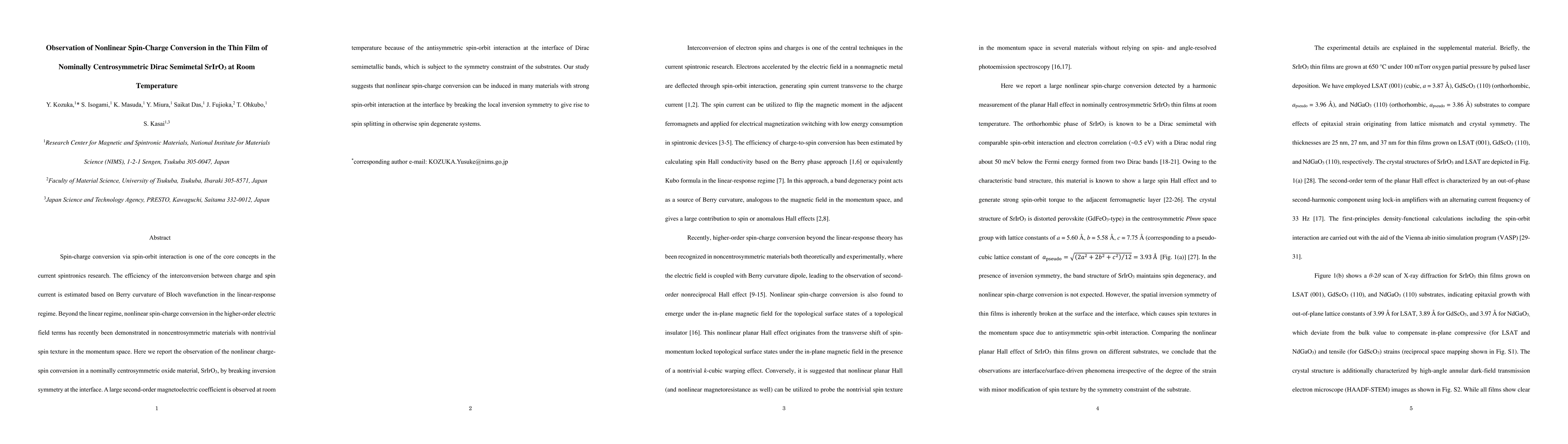This study reports the observation of nonlinear spin-charge conversion in the thin film of centrosymmetric Dirac semimetal SrIrO3 at room temperature by breaking inversion symmetry at the interface. A large second-order magnetoelectric coefficient indicates antisymmetric spin-orbit interaction at the interface, suggesting that nonlinear spin-charge conversion can be induced in many materials with strong spin-orbit interaction by disrupting local inversion symmetry.