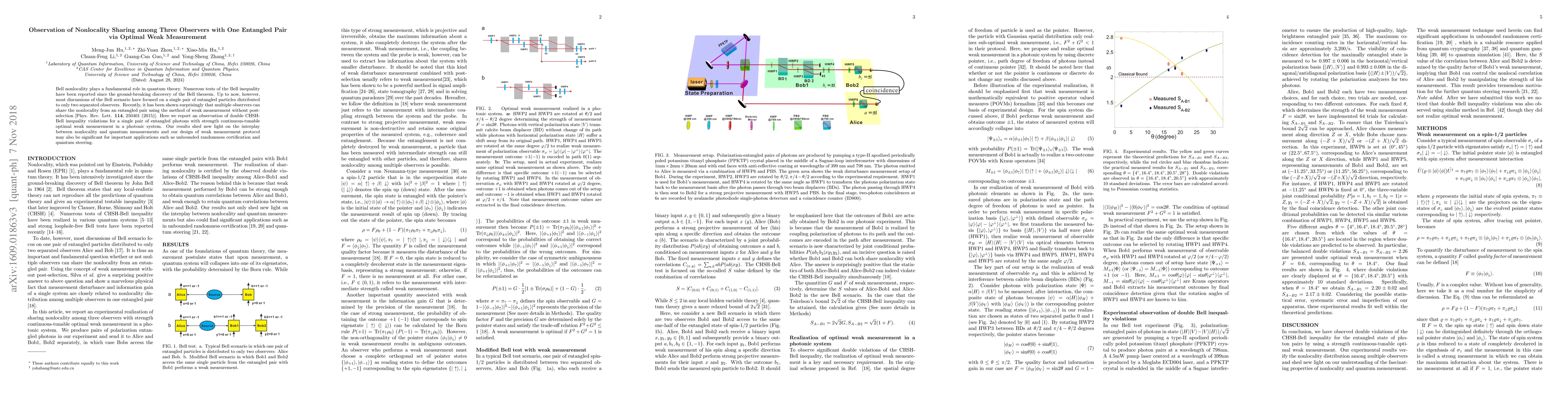 This paper reports the first observation of double CHSH-Bell inequality violations using a single pair of entangled photons and optimal weak measurements, demonstrating nonlocality sharing among three observers. The findings enhance understanding of quantum nonlocality and have potential applications in randomness certification and quantum steering.