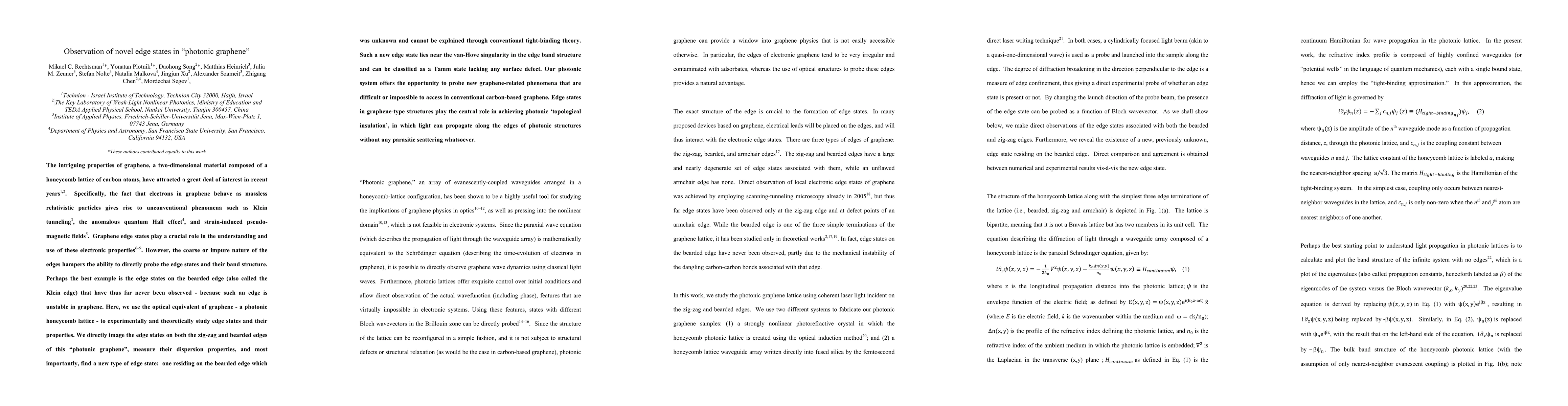 The intriguing properties of graphene, a two-dimensional material composed of a honeycomb lattice of carbon atoms, have attracted a great deal of interest in recent years. Specifically, the fact that electrons in graphene behave as massless relativistic particles gives rise to unconventional phenomena such as Klein tunneling, the anomalous quantum Hall effect, and strain-induced pseudo-magnetic fields. Graphene edge states play a crucial role in the understanding and use of these electronic properties. However, the coarse or impure nature of the edges hampers the ability to directly probe the edge states and their band structure. Perhaps the best example is the edge states on the bearded edge (also called the Klein edge) that have thus far never been observed - because such an edge is unstable in graphene. Here, we use the optical equivalent of graphene - a photonic honeycomb lattice - to experimentally and theoretically study edge states and their properties. We directly image the edge states on both the zig-zag and bearded edges of this photonic graphene, measure their dispersion properties, and most importantly, find a new type of edge state: one residing on the bearded edge which was unknown and cannot be explained through conventional tight-binding theory. Such a new edge state lies near the van-Hove singularity in the edge band structure and can be classified as a Tamm state lacking any surface defect. Our photonic system offers the opportunity to probe new graphene-related phenomena that are difficult or impossible to access in conventional carbon-based graphene. Edge states in graphene-type structures play the central role in achieving photonic topological insulation, in which light can propagate along the edges of photonic structures without any parasitic scattering whatsoever.