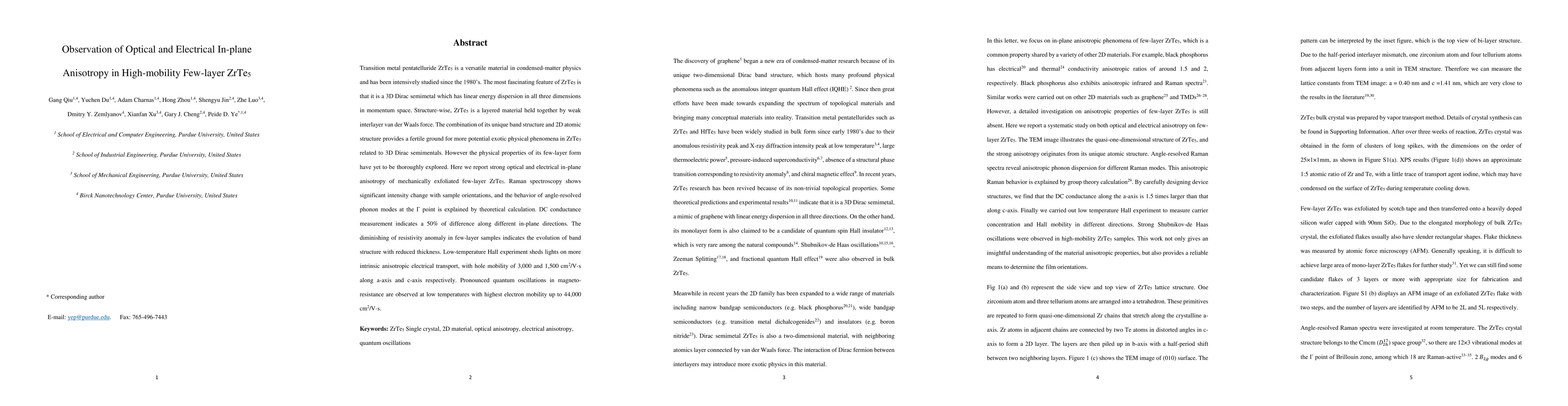 This paper observes significant optical and electrical in-plane anisotropy in few-layer ZrTe5, revealing strong variations in Raman intensity and electrical conductance with sample orientation. The study highlights the material's potential for exotic physical phenomena and demonstrates high electron mobility, up to 44,000 cm²/Vs, in magneto-resistance measurements.