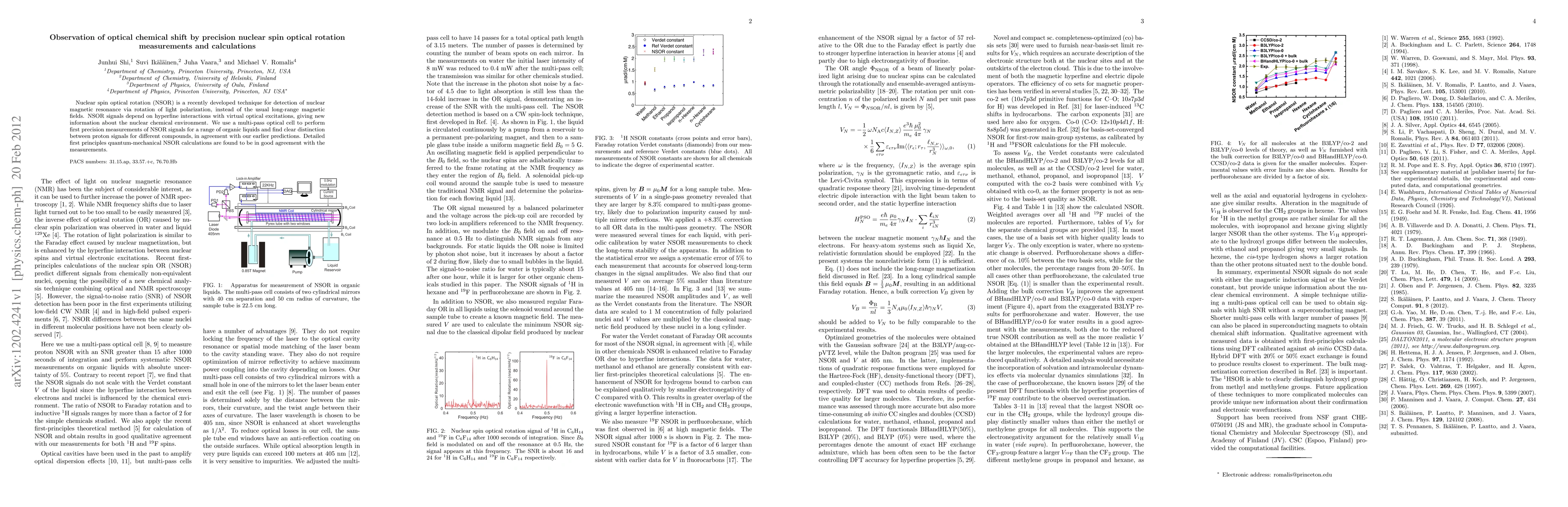 Nuclear spin optical rotation (NSOR) is a recently developed technique for detection of nuclear magnetic resonance via rotation of light polarization, instead of the usual long-range magnetic fields. NSOR signals depend on hyperfine interactions with virtual optical excitations, giving new information about the nuclear chemical environment. We use a multi-pass optical cell to perform first precision measurements of NSOR signals for a range of organic liquids and find clear distinction between proton signals for different compounds, in agreement with our earlier predictions. Detailed first principles quantum-mechanical NSOR calculations are found to be in good agreement with the measurements.
