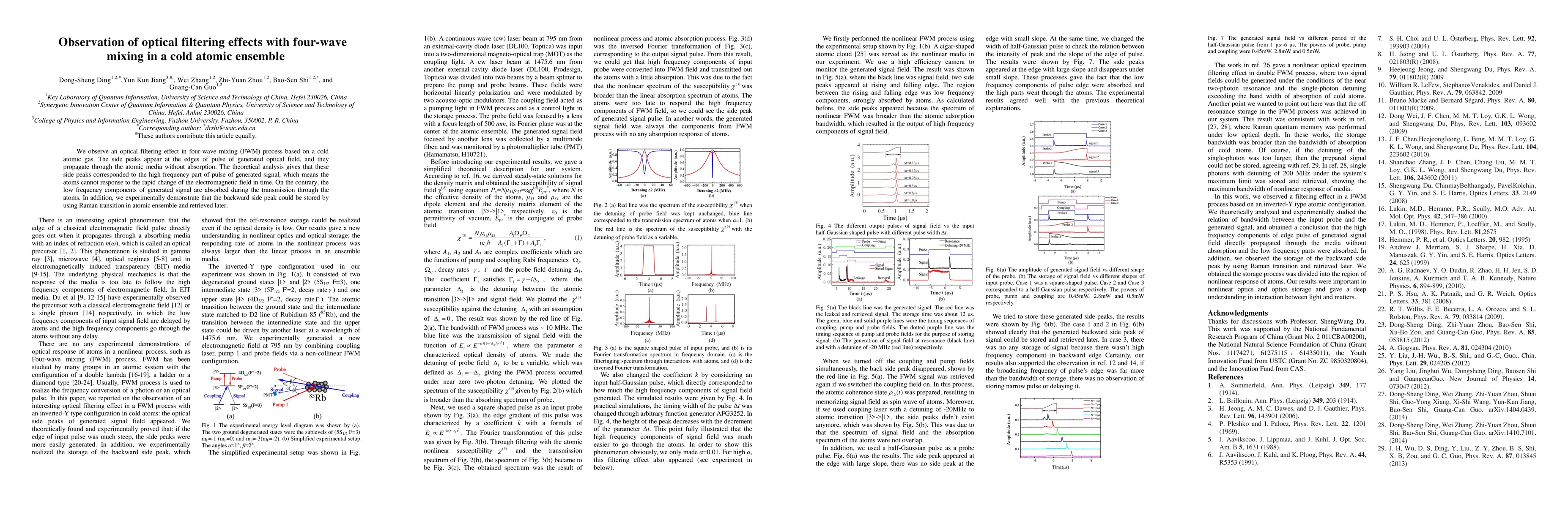 This paper observes optical filtering effects in four-wave mixing within a cold atomic ensemble, where side peaks propagate without absorption due to the atoms' inability to respond to rapid electromagnetic field changes. The study also demonstrates the storage and retrieval of a backward side peak via Raman transitions.