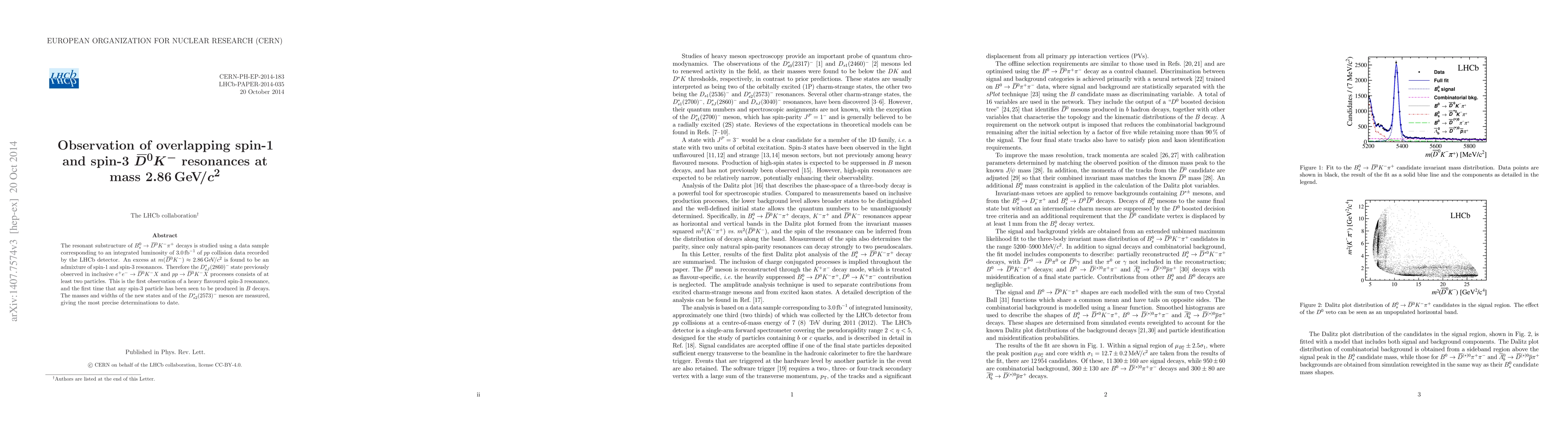 The study reveals an excess in $B_s^0$ decays at $2.86\,{\rm GeV}/c^2$ due to overlapping spin-1 and spin-3 $\bar{D}^0 K^-$ resonances, marking the first observation of a spin-3 heavy flavoured resonance in $B$ decays. Precise measurements of the new states and the $D^*_{s2}(2573)^-$ meson are provided.