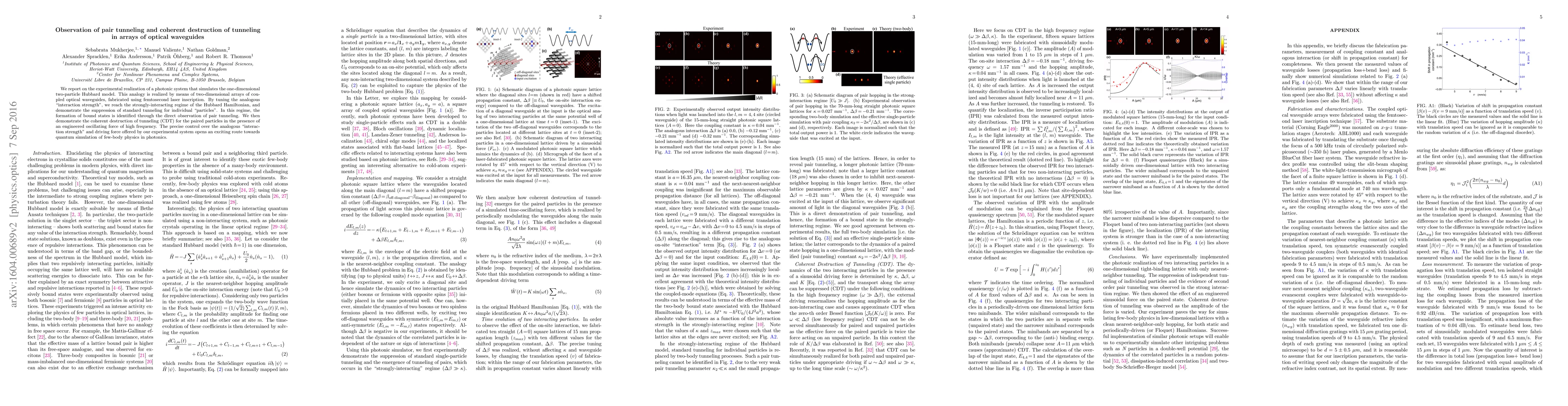 This paper reports on the experimental realization of a photonic system simulating the one-dimensional two-particle Hubbard model using coupled optical waveguides. The study demonstrates pair tunneling and coherent destruction of tunneling in the strongly-interacting regime, showcasing potential for quantum simulation of few-body physics in photonics.
