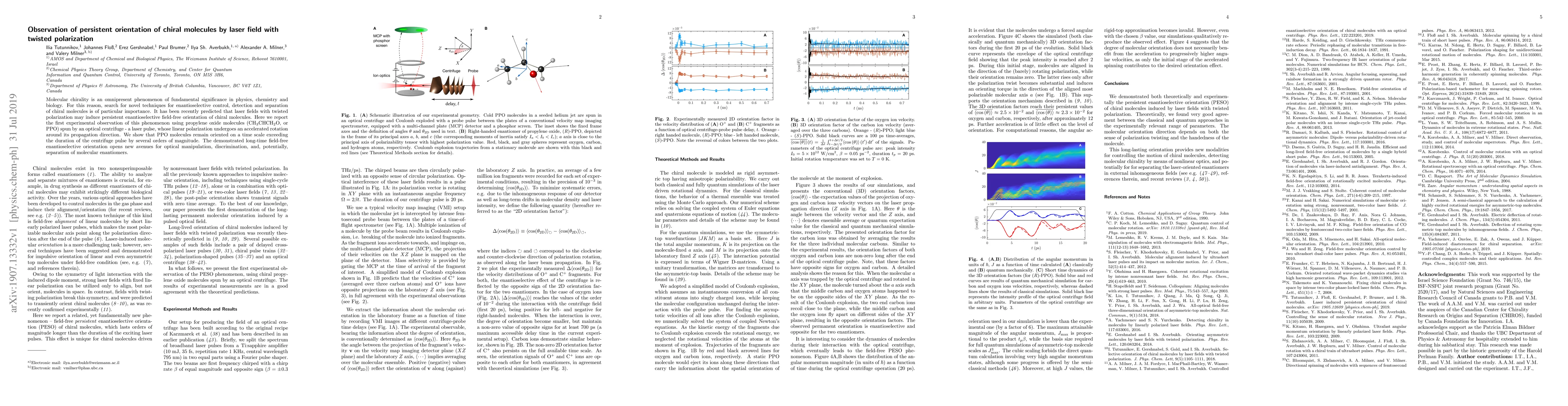 This paper reports the first experimental observation of persistent enantioselective orientation of chiral propylene oxide molecules using laser fields with twisted polarization, demonstrating long-term field-free orientation that could enable new methods for optical manipulation and separation of enantiomers.