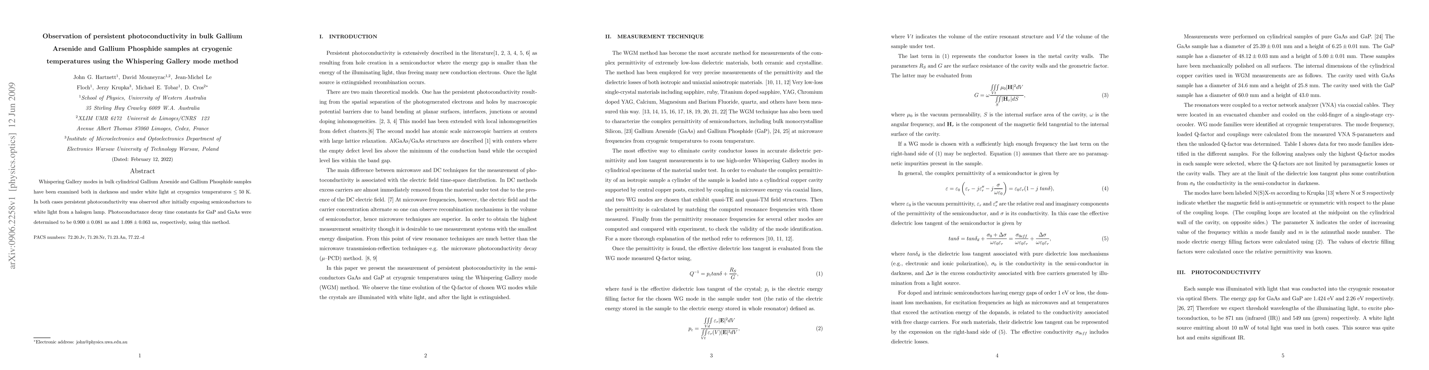 Whispering Gallery modes in bulk cylindrical Gallium Arsenide and Gallium Phosphide samples have been examined both in darkness and under white light at cryogenics temperatures < 50 K. In both cases persistent photoconductivity was observed after initially exposing semiconductors to white light from a halogen lamp. Photoconductance decay time constants for GaP and GaAs were determined to be 0.900 +/- 0.081 ns and 1.098 +/- 0.063 ns, respectively, using this method.