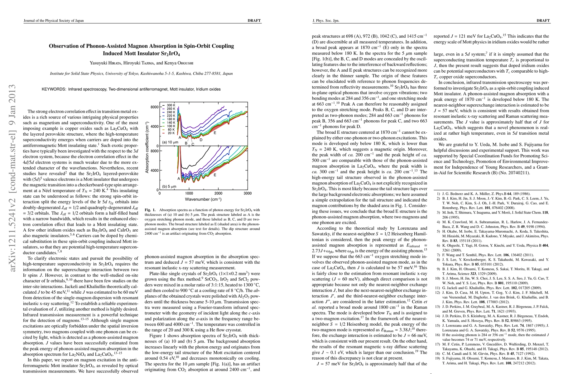This study investigates phonon-assisted magnon absorption in Sr$_{2}$IrO$_{4}$, a two-dimensional Mott insulator, revealing a phonon-assisted magnon mode at 1870 cm$^{-1}$ below 180 K. The superexchange interaction $J$ is estimated at 57 meV, suggesting potential for high-temperature superconductivity in iridium oxides.