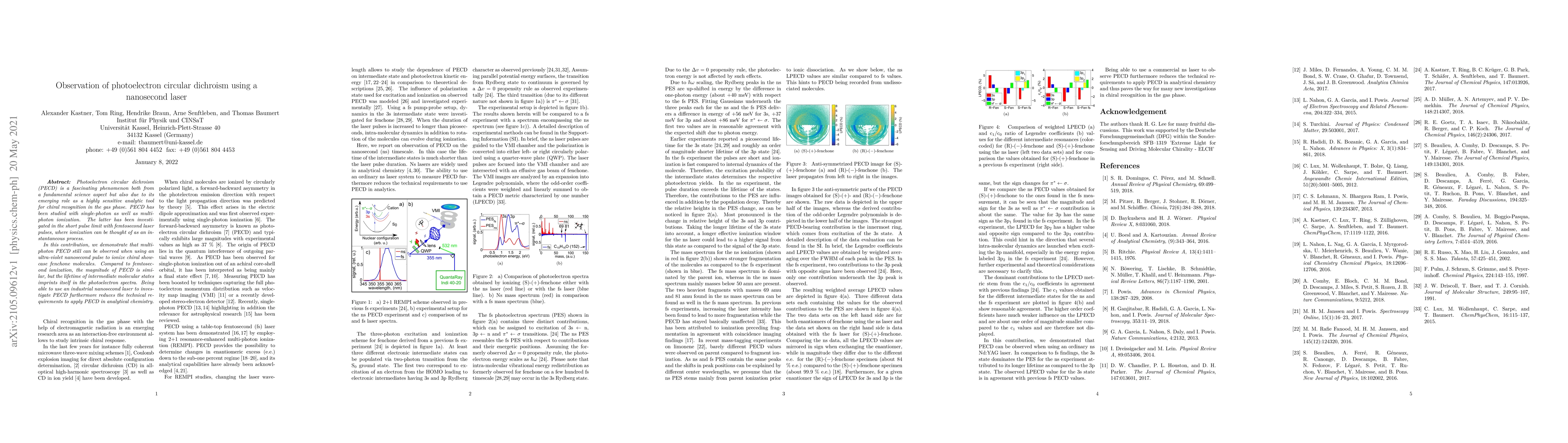 This paper demonstrates the observation of photoelectron circular dichroism (PECD) using a nanosecond laser, showing that PECD can be observed with longer pulses compared to the commonly used femtosecond pulses. This finding reduces technical requirements and opens up possibilities for applying PECD in analytical chemistry.