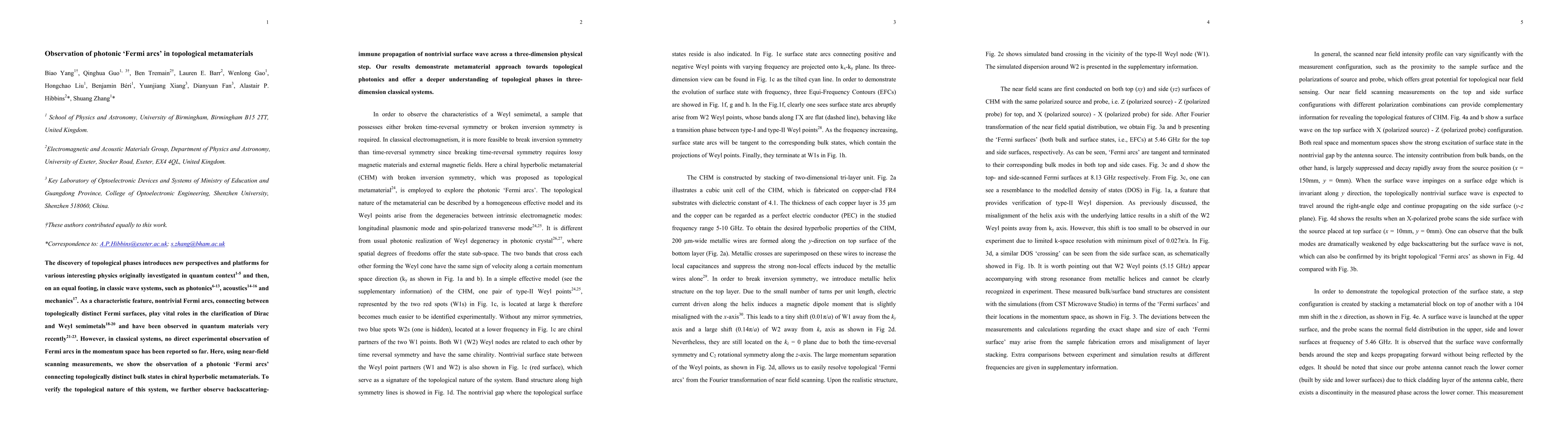 This paper reports the first experimental observation of photonic Fermi arcs in chiral hyperbolic metamaterials using near-field scanning measurements, showcasing the topological nature of these systems. The study also verifies the backscattering-immune propagation of surface waves, highlighting the potential of metamaterials in topological photonics.