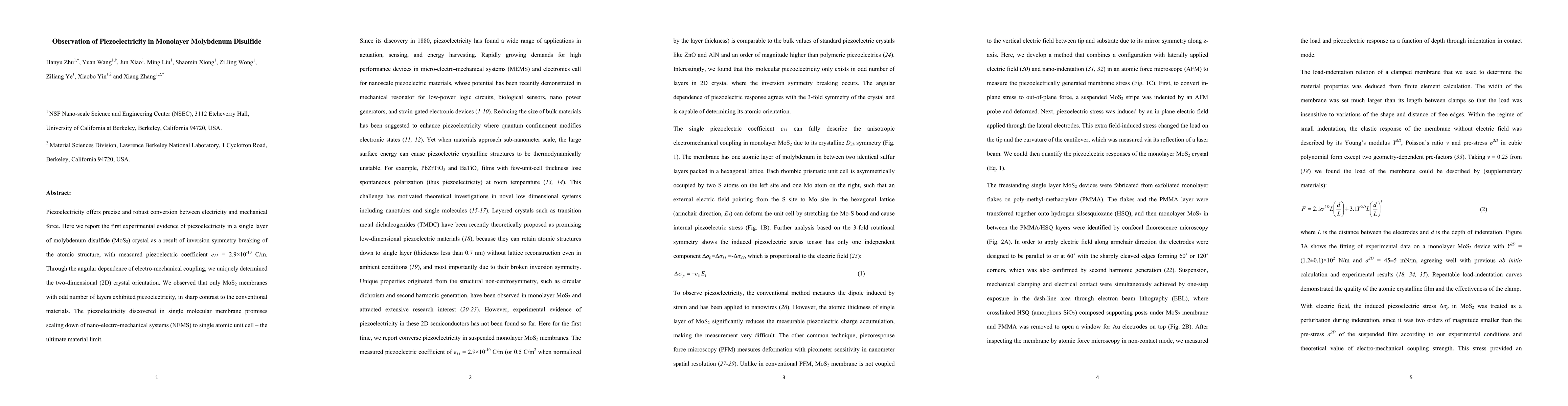 The study reports the first observation of piezoelectricity in monolayer molybdenum disulfide (MoS2), attributing it to symmetry breaking in its atomic structure, with a measured piezoelectric coefficient of 2.9e-10 C/m. Notably, only MoS2 membranes with an odd number of layers exhibited this property, suggesting potential for scaling down nano-electro-mechanical systems.