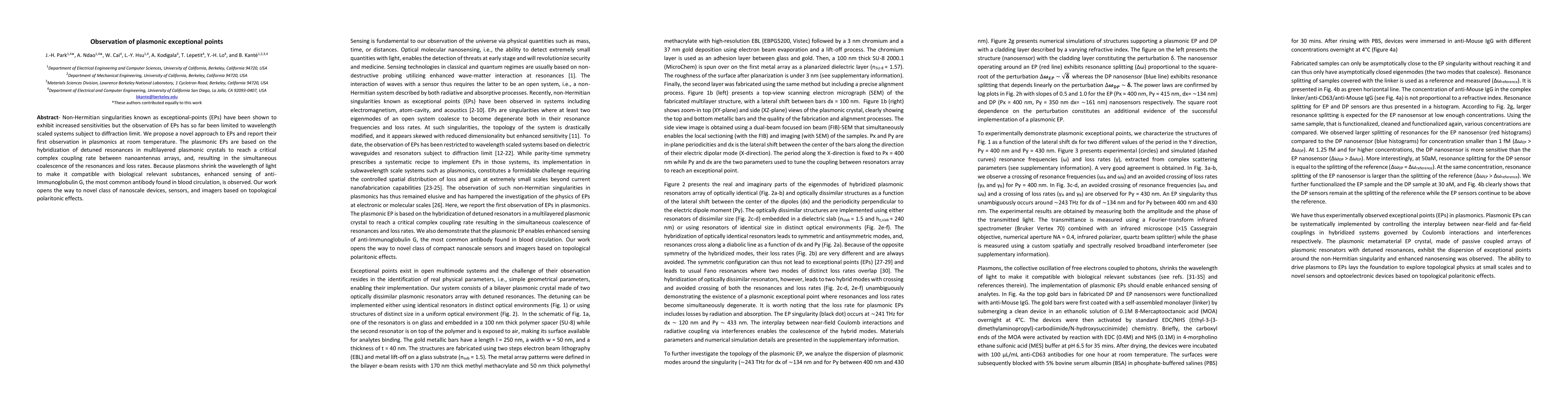Researchers observed plasmonic exceptional points at room temperature, enabling enhanced sensing of biological substances like anti-Immunoglobulin G. This discovery opens the way for novel nanoscale devices, sensors, and imagers based on topological polaritonic effects.
