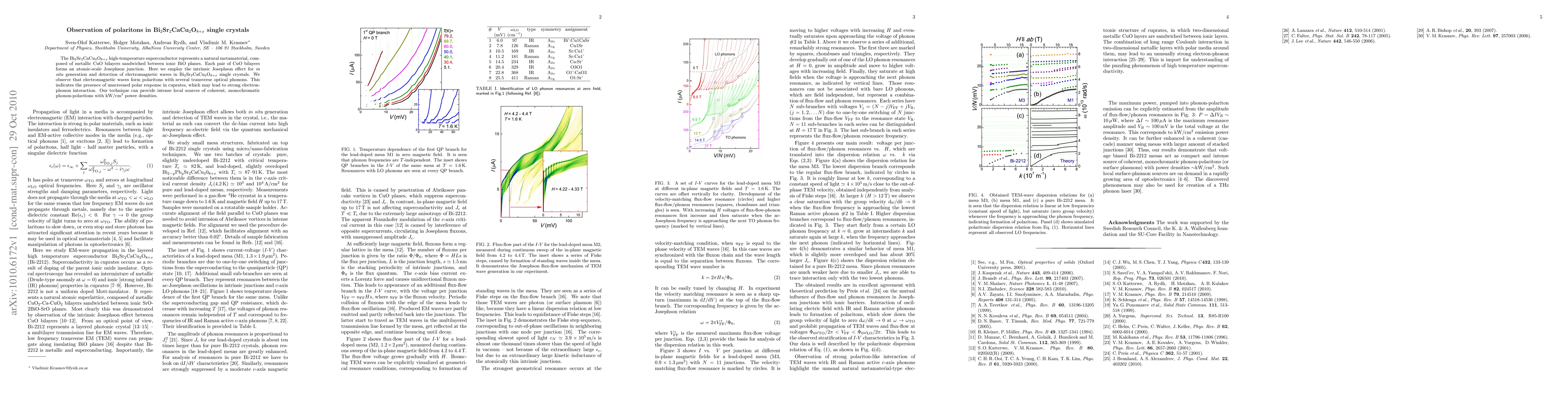 The paper reports the observation of polaritons, formed by electromagnetic waves interacting with transverse optical phonons, in Bi2Sr2CaCu2O8+x single crystals. This was achieved by utilizing the intrinsic Josephson effect for in situ generation and detection of these waves, suggesting a strong electron-phonon interaction in cuprates and the potential for intense, localized, coherent phonon-polariton sources.