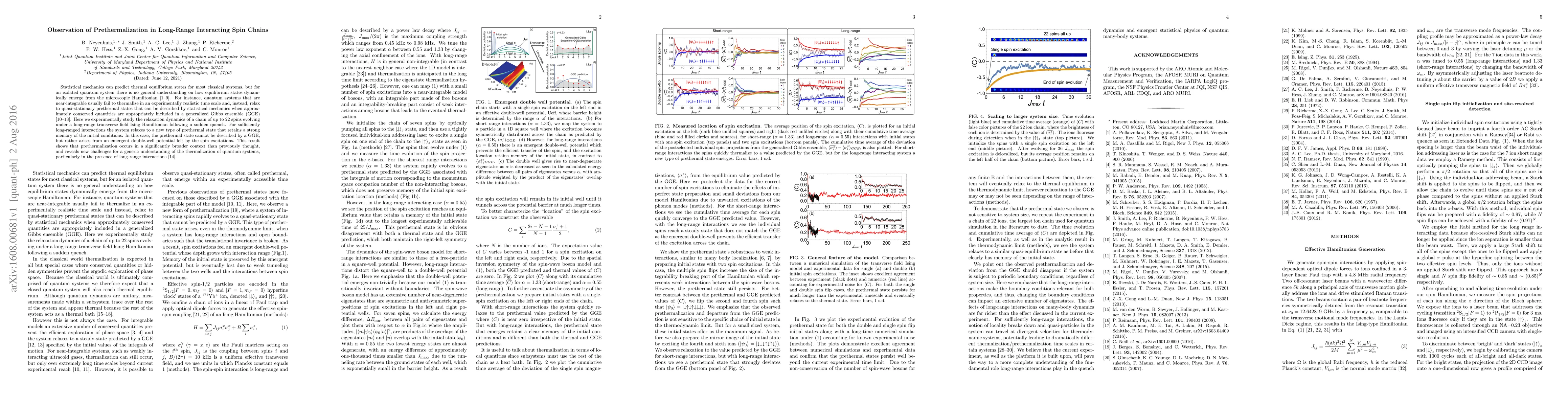 Statistical mechanics can predict thermal equilibrium states for most classical systems, but for an isolated quantum system there is no general understanding on how equilibrium states dynamically emerge from the microscopic Hamiltonian. For instance, quantum systems that are near-integrable usually fail to thermalize in an experimentally realistic time scale and, instead, relax to quasi-stationary prethermal states that can be described by statistical mechanics when approximately conserved quantities are appropriately included in a generalized Gibbs ensemble (GGE). Here we experimentally study the relaxation dynamics of a chain of up to 22 spins evolving under a long-range transverse field Ising Hamiltonian following a sudden quench. For sufficiently long-ranged interactions the system relaxes to a new type of prethermal state that retains a strong memory of the initial conditions. In this case, the prethermal state cannot be described by a GGE, but rather arises from an emergent double-well potential felt by the spin excitations. This result shows that prethermalization occurs in a significantly broader context than previously thought, and reveals new challenges for a generic understanding of the thermalization of quantum systems, particularly in the presence of long-range interactions.