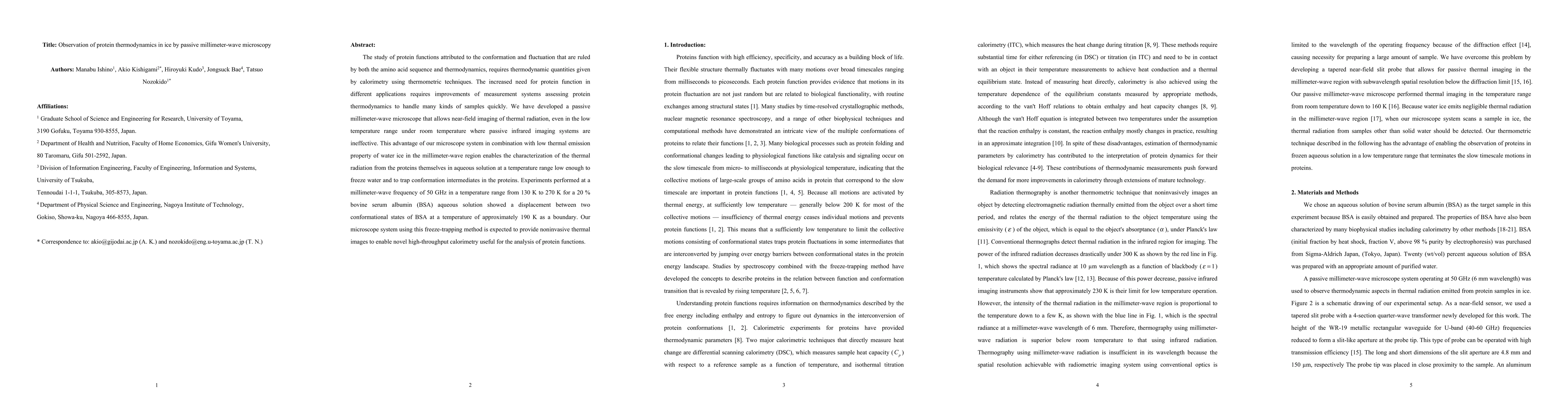 The study of protein functions attributed to the conformation and fluctuation that are ruled by both the amino acid sequence and thermodynamics, requires thermodynamic quantities given by calorimetry using thermometric techniques. The increased need for protein function in different applications requires improvements of measurement systems assessing protein thermodynamics to handle many kinds of samples quickly. We have developed a passive millimeter-wave microscope that allows near-field imaging of thermal radiation, even in the low temperature range under room temperature where passive infrared imaging systems are ineffective. This advantage of our microscope system in combination with low thermal emission property of water ice in the millimeter-wave region enables the characterization of the thermal radiation from the proteins themselves in aqueous solution at a temperature range low enough to freeze water and to trap conformation intermediates in the proteins. Experiments performed at a millimeter-wave frequency of 50 GHz in a temperature range from 130 K to 270 K for a 20 % bovine serum albumin (BSA) aqueous solution showed a displacement between two conformational states of BSA at a temperature of approximately 190 K as a boundary. Our microscope system using this freeze-trapping method is expected to provide noninvasive thermal images to enable novel high-throughput calorimetry useful for the analysis of protein functions.